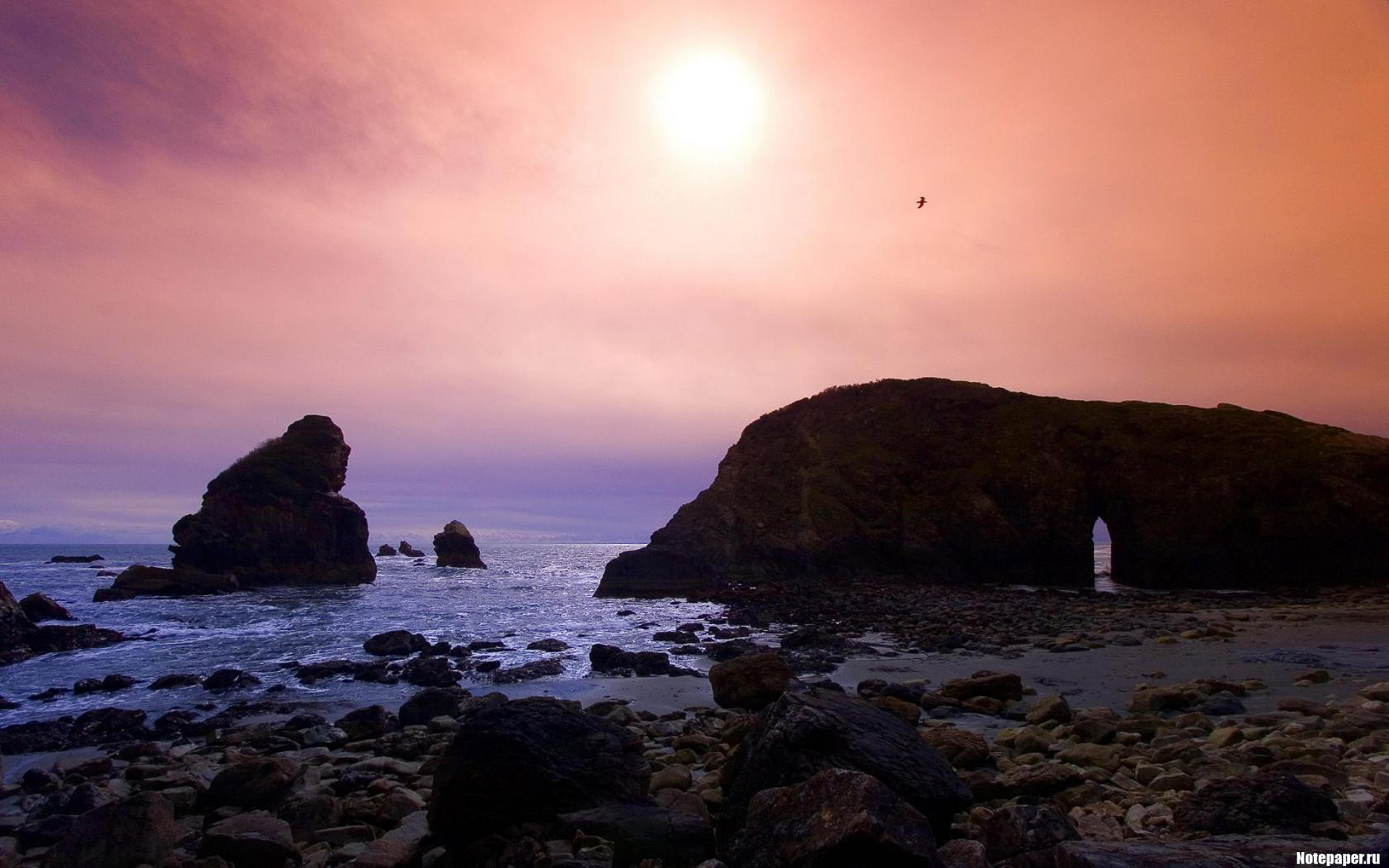 Description: A sunset over a rocky beach with a rock formation in the foreground and a bird flying over the rocks.