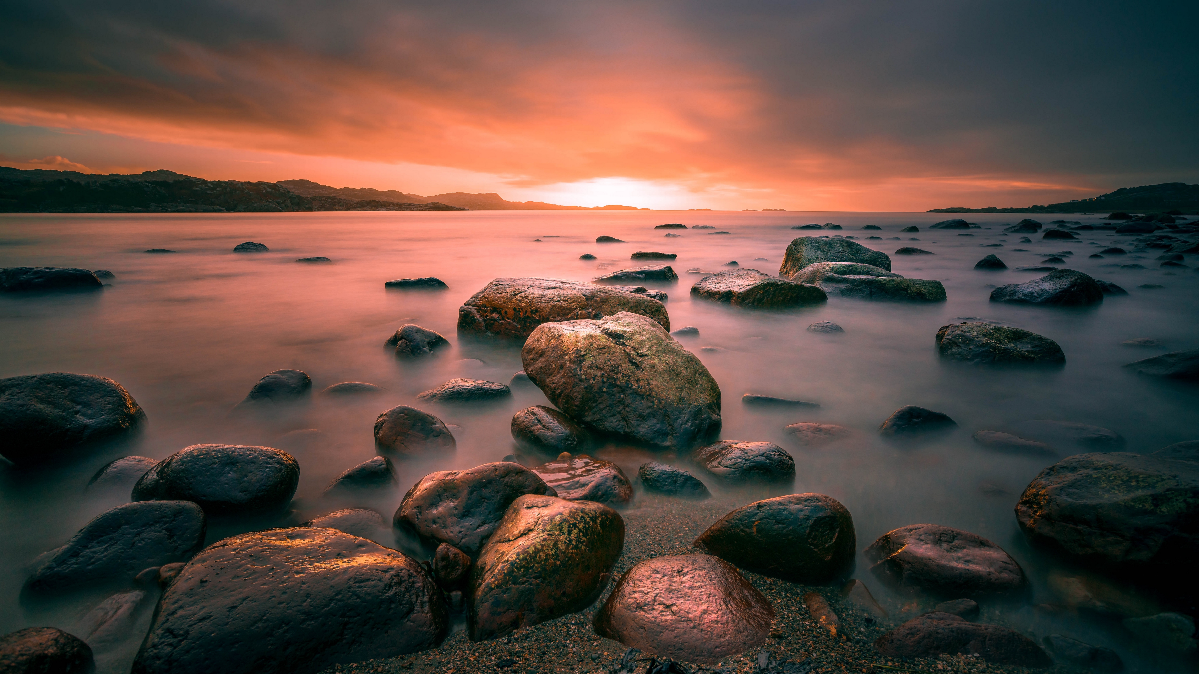 Description: A sunset over a rocky beach with rocks in the water and a cloudy sky above it.
