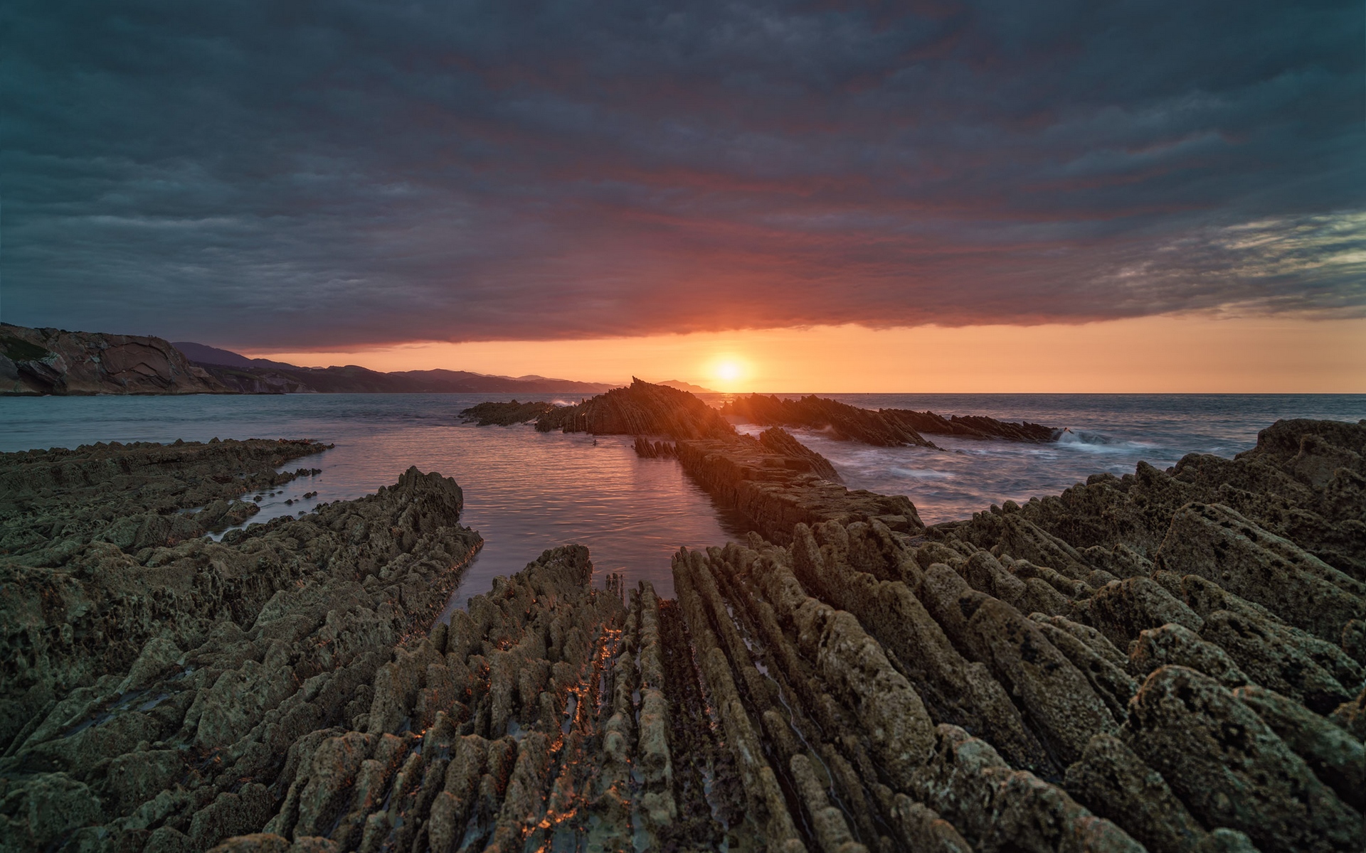 Description: A sunset over a rocky beach with a body of water in the foreground and a mountain range in the distance.