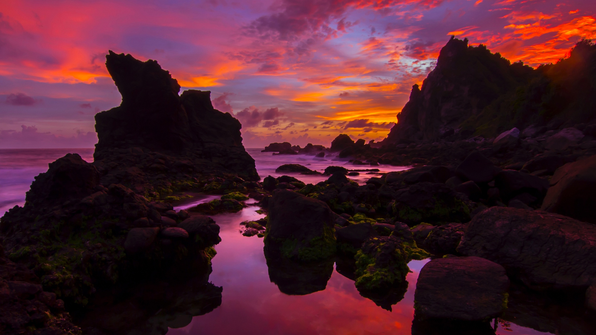 Description: A sunset over a rocky beach with a pink sky and purple clouds above it and a body of water.