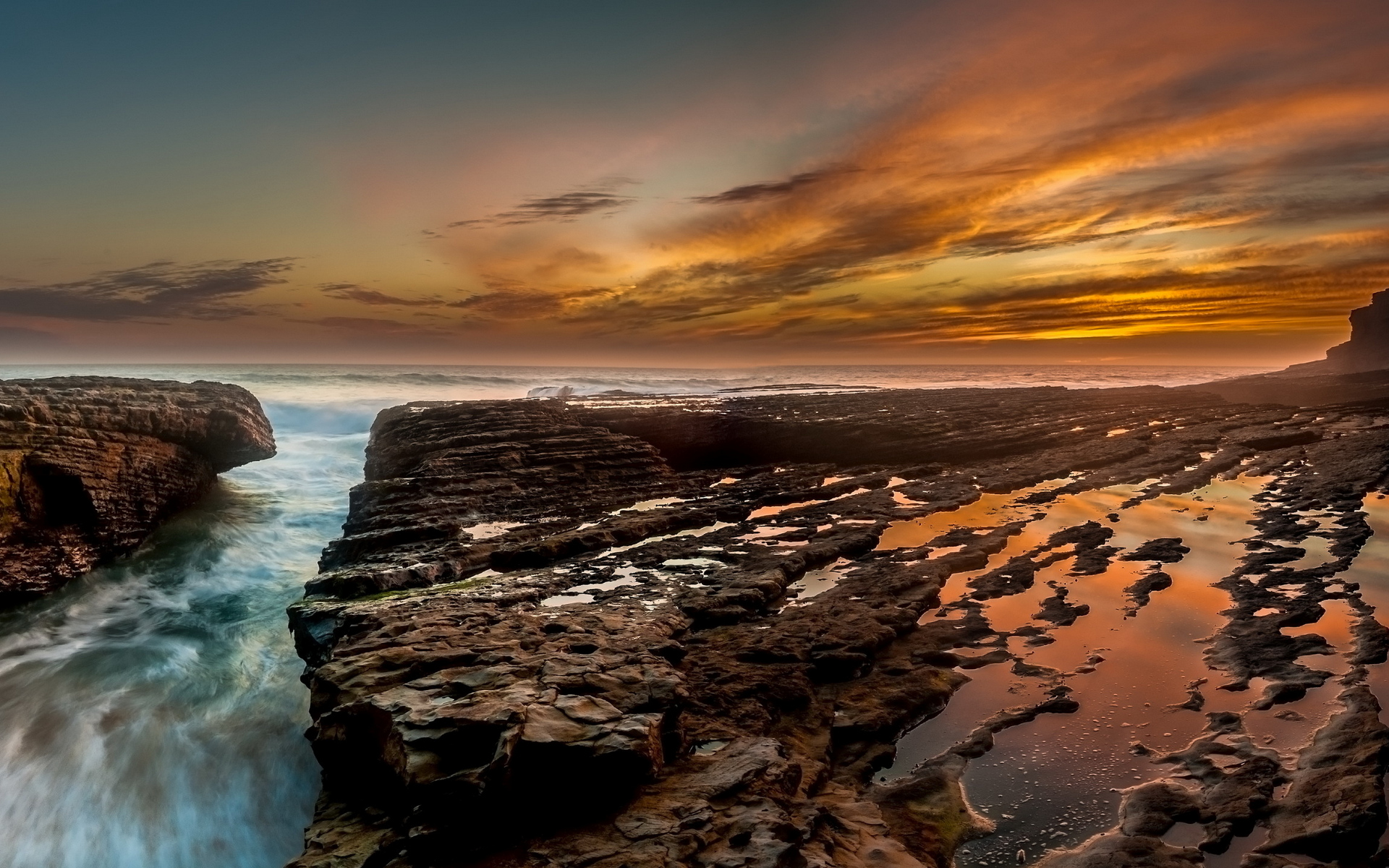 Description: A sunset over a rocky beach with a body of water running through it and a rocky cliff in the foreground.