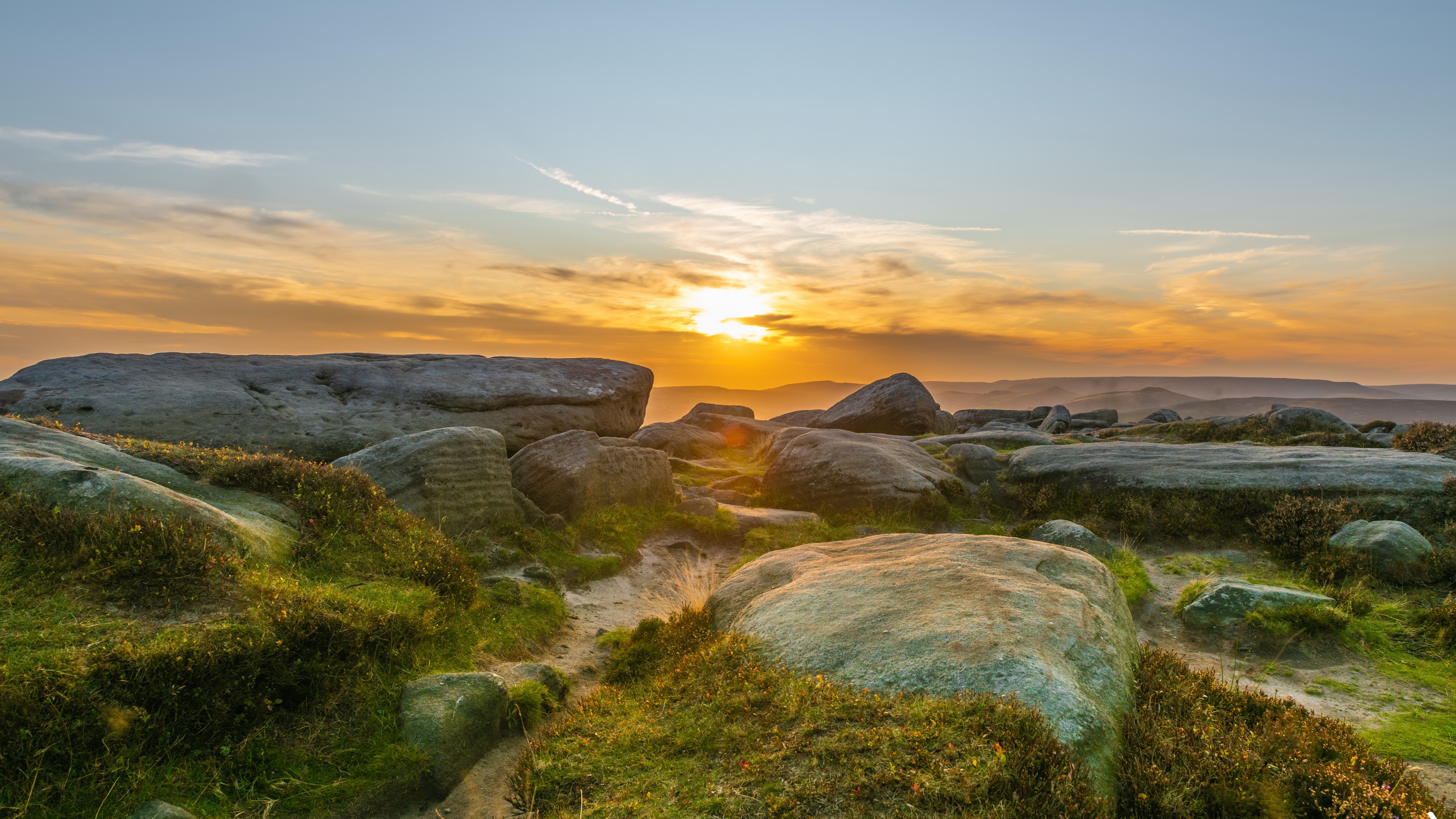 Description: A sunset over a rocky landscape with grass and rocks in the foreground and a few rocks in the foreground.