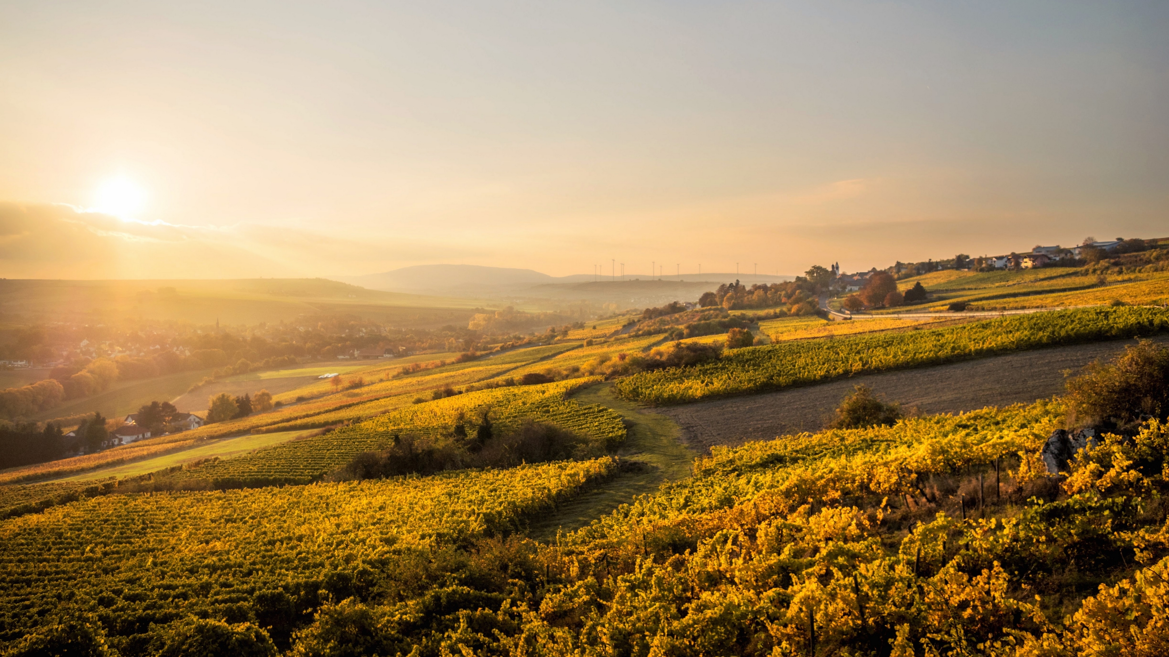 Description: A scenic view of a rural countryside with a sunset in the background and a road winding through the fields.