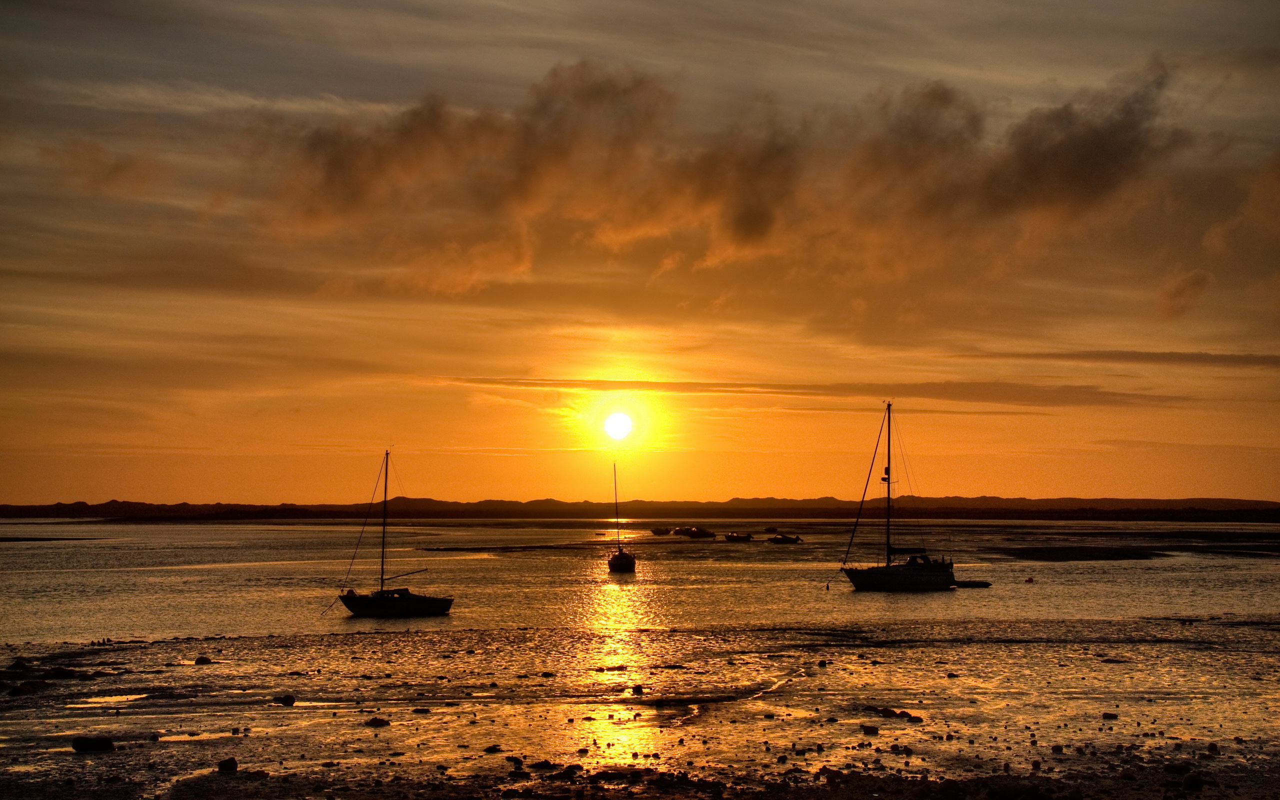 Description: A sunset with sailboats in the water and clouds in the sky above them.