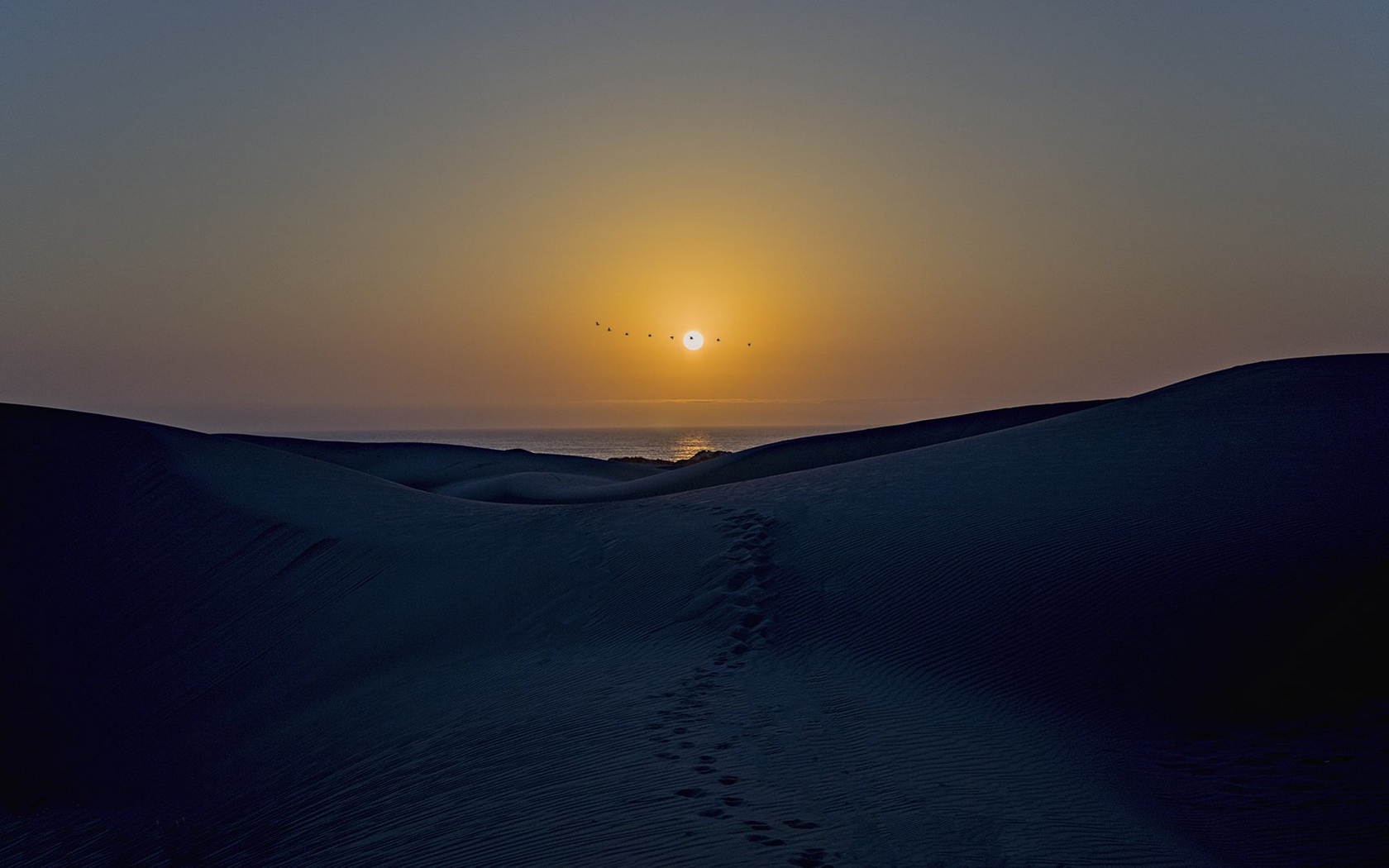 Description: A sunset over a sandy area with footprints in the sand and a bird flying in the distance with a bright orange sun in the distance.