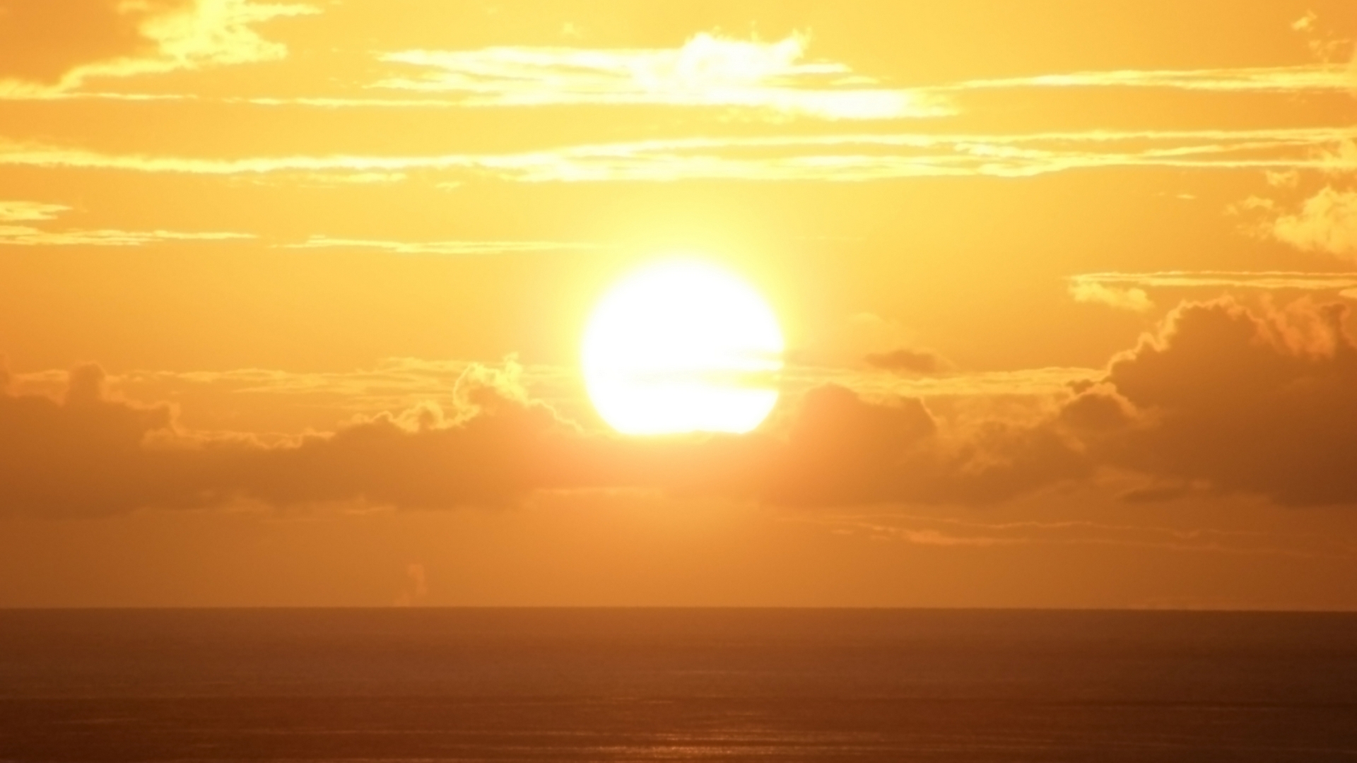 Description: A sunset with a large sun in the middle of the sky and clouds in the background.