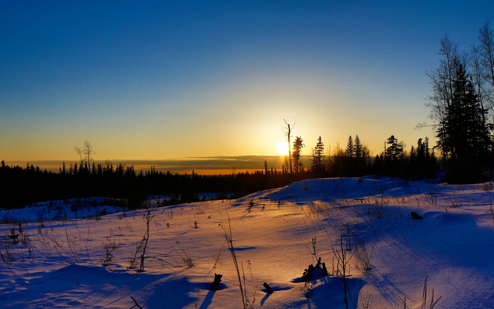 Description: A sunset over a snowy field with trees in the background and a few snow on the ground with a few snow on the ground.