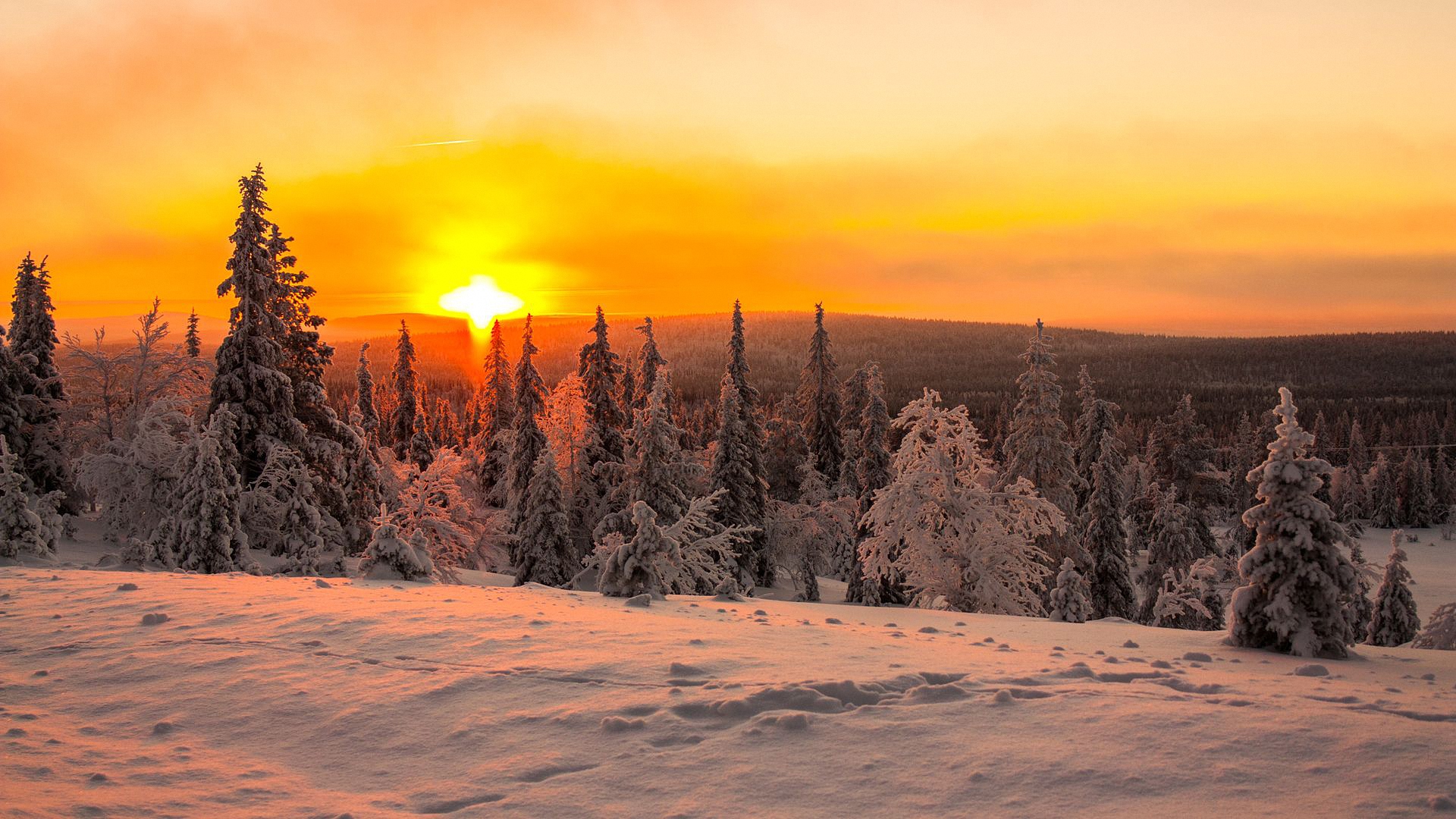 Description: A sunset over a snowy forest with trees covered in snow and snow flakes on the ground and a person on skis.
