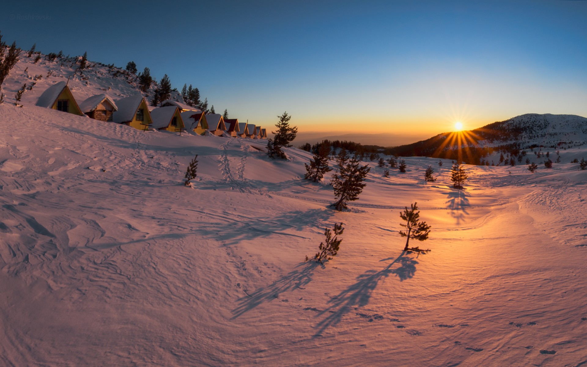 Description: A sunset over a snowy mountain with a line of tents in the distance and trees in the foreground.