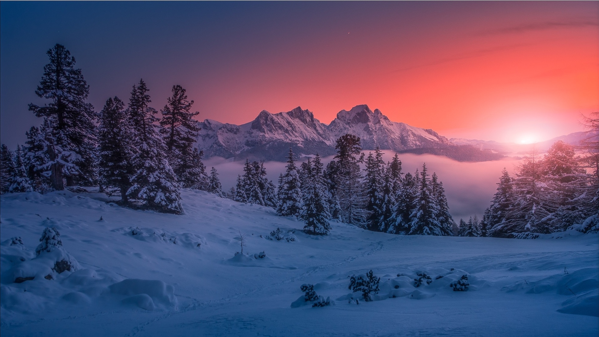 Description: A sunset over a snowy mountain with trees and snow covered ground and mountains in the background with a red sky.