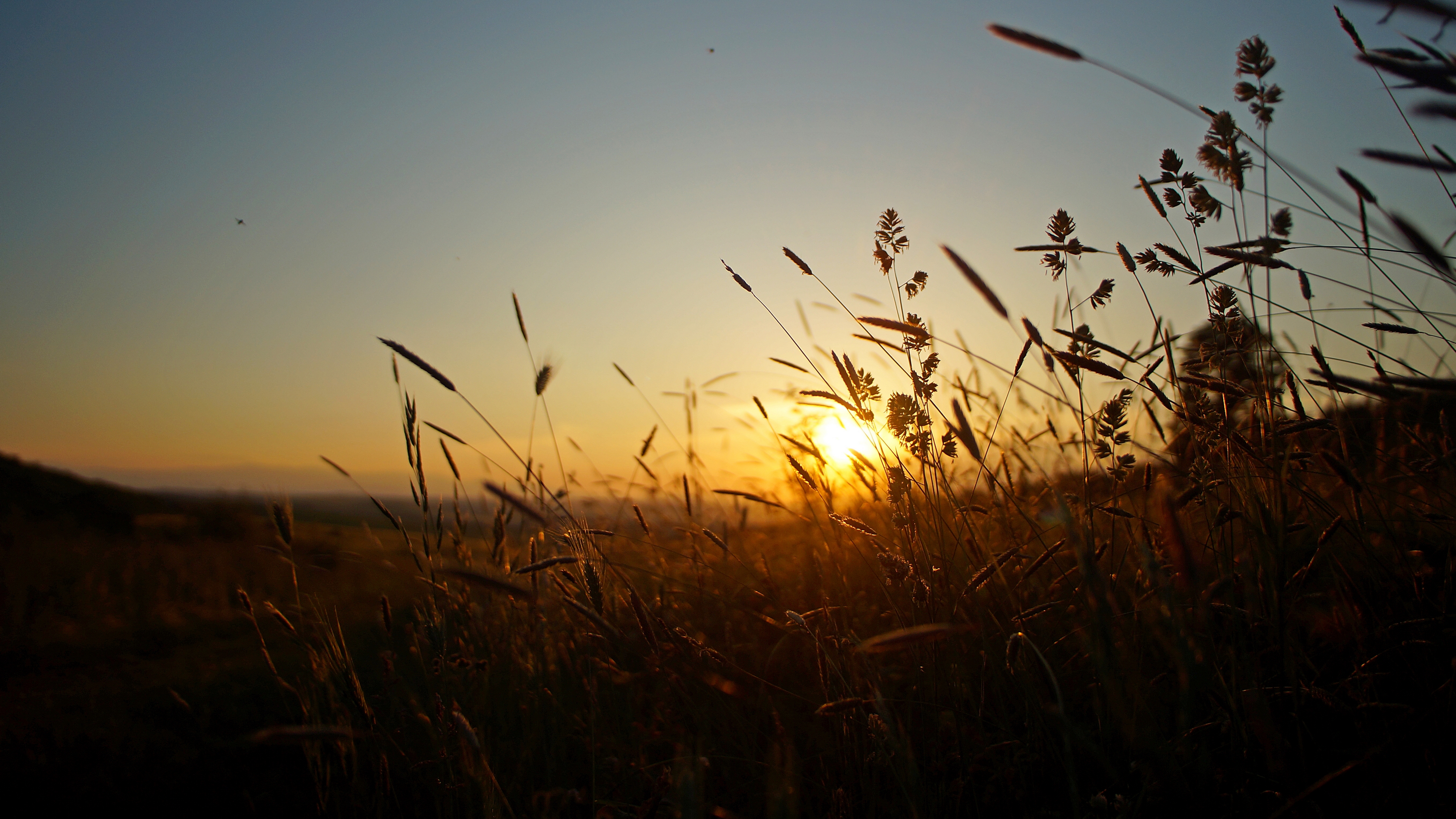 Description: A field with tall grass and the sun setting in the background with a few clouds in the sky above.