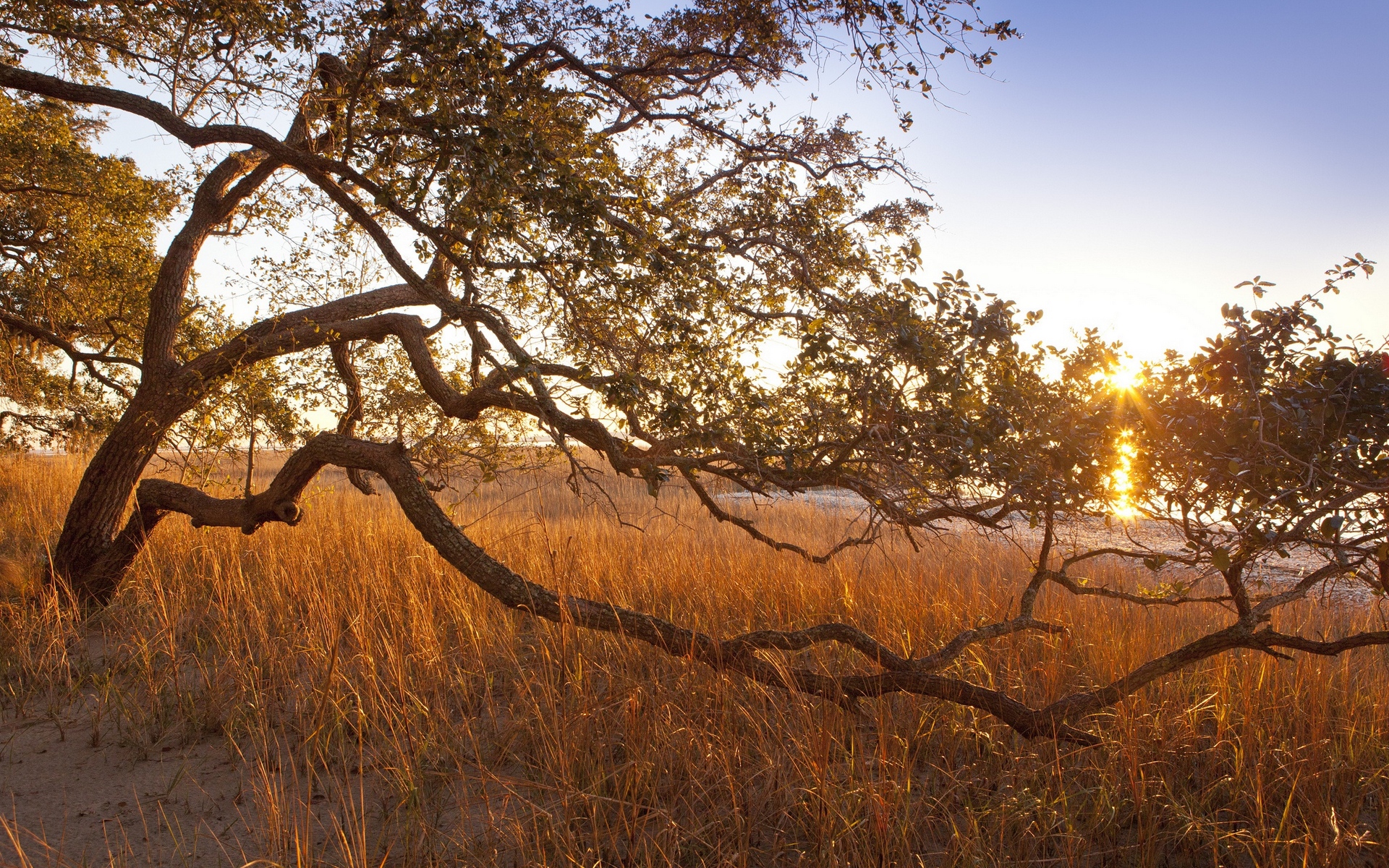 Description: A tree branch in a field with the sun setting in the background and a few trees in the foreground.