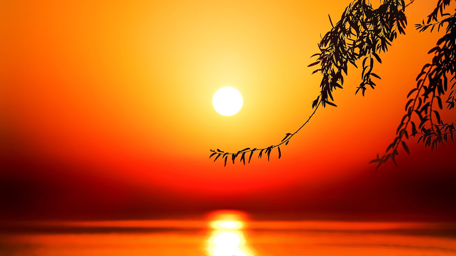 Description: A sunset with a tree branch in the foreground and the sun in the background with a bright orange sky.