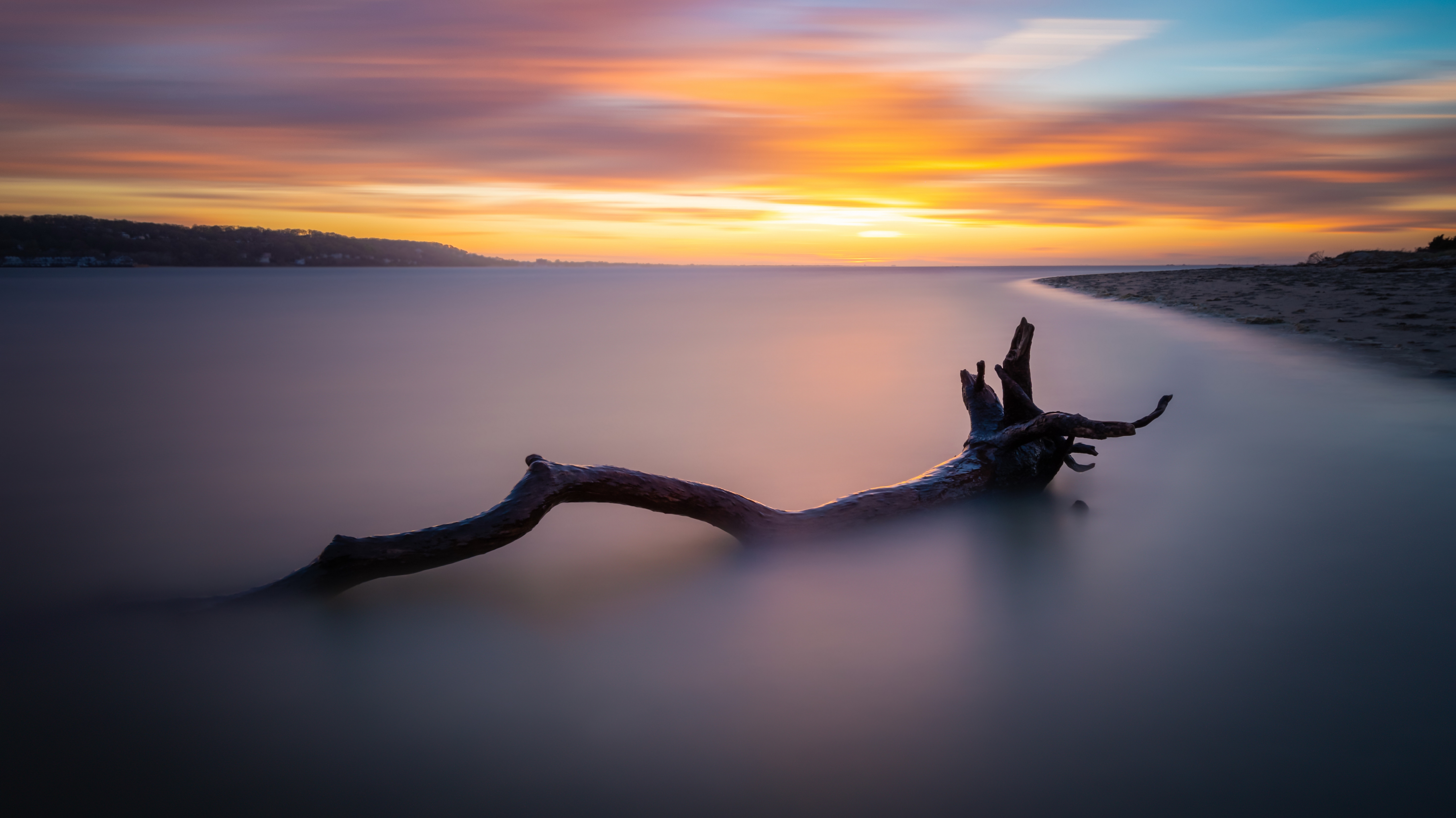 Description: A tree branch is in the water at sunset with a colorful sky in the background and a long exposure of light.