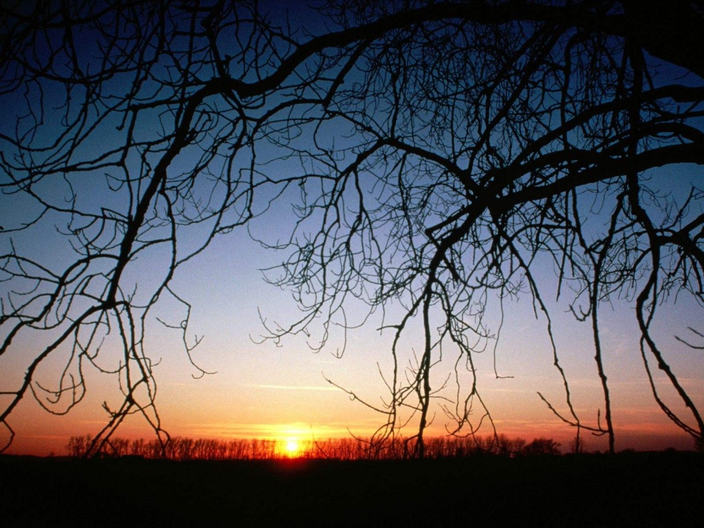 Description: A sunset seen through the branches of a tree in a field with a sky background and a few trees in the foreground.