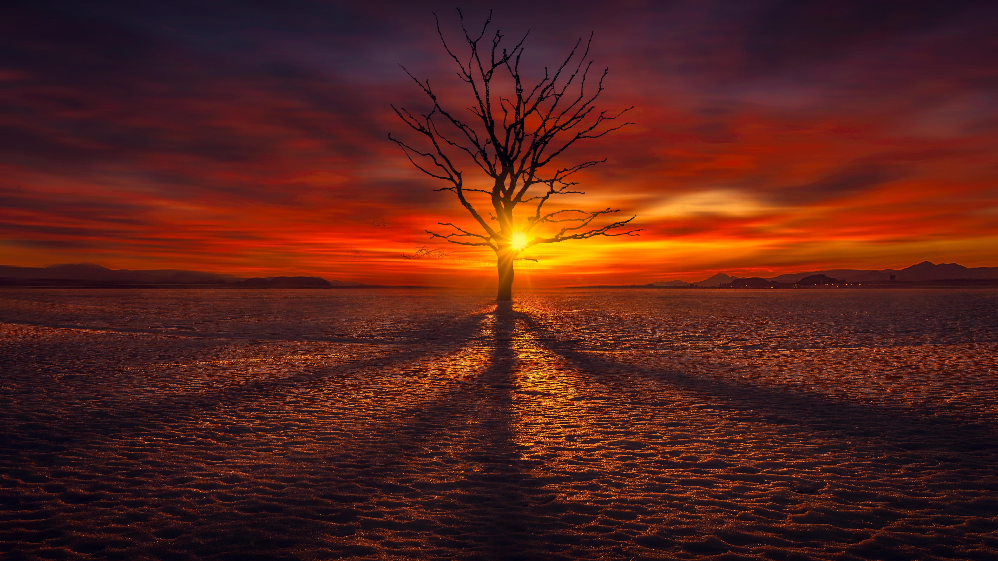 Description: A tree is casting a shadow on the ground at sunset with a red sky in the background and a long thin line of clouds.