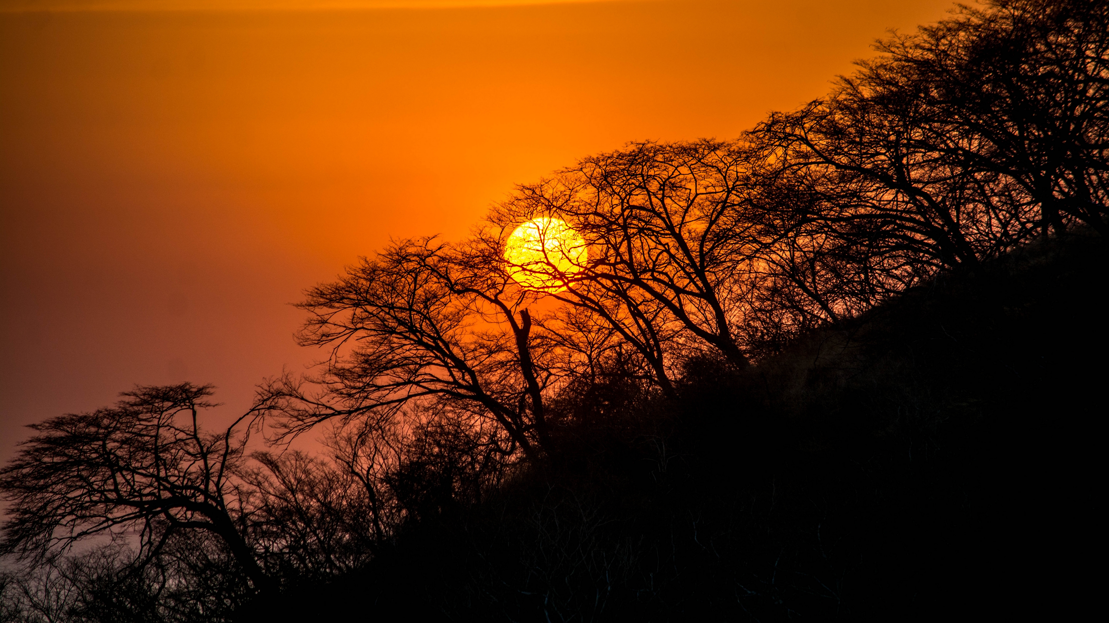 Description: A sunset with a few trees in the foreground and a yellow sun in the background with a dark sky.