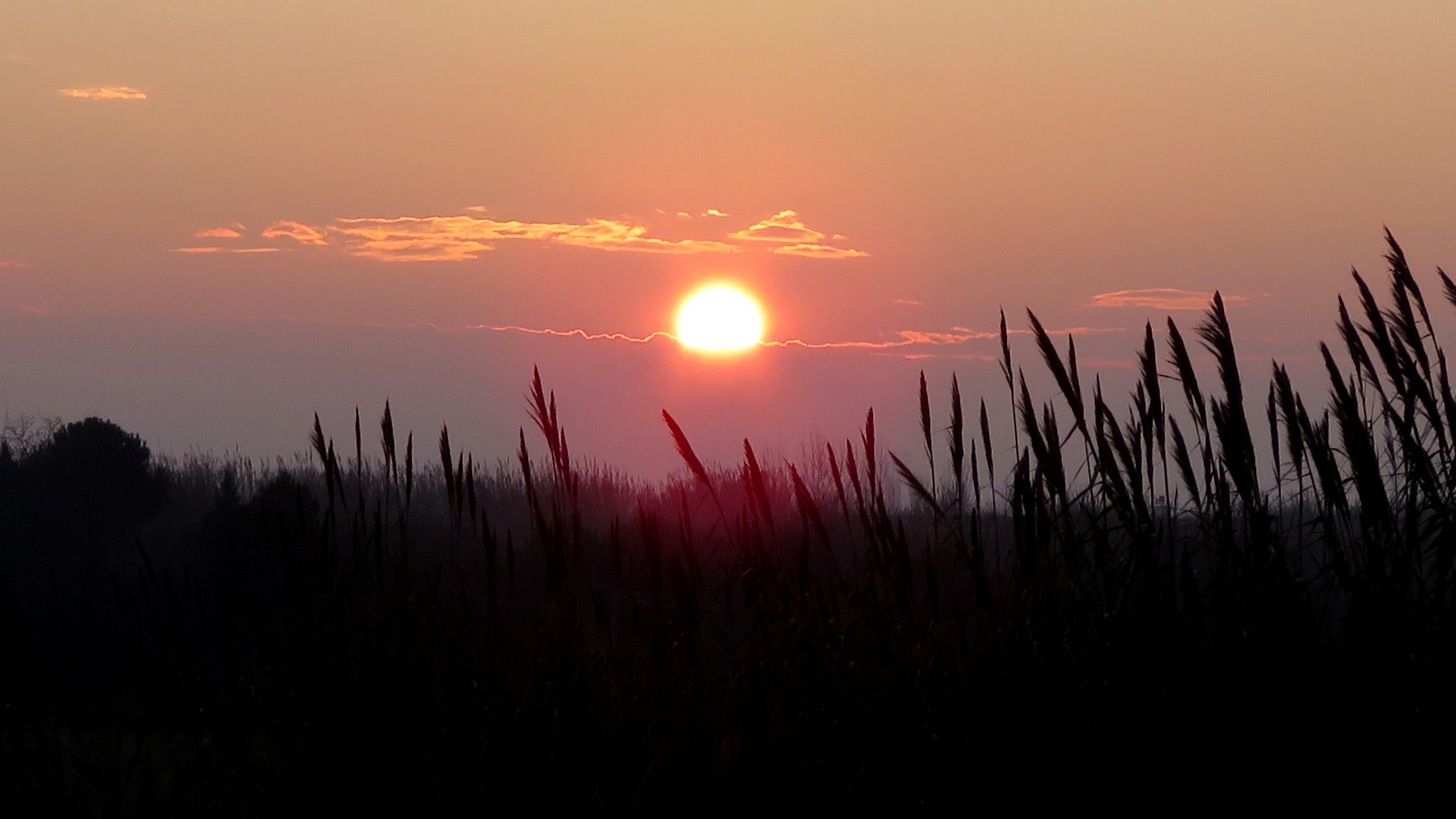 Description: A sunset with the sun setting behind the trees and grass in the foreground.