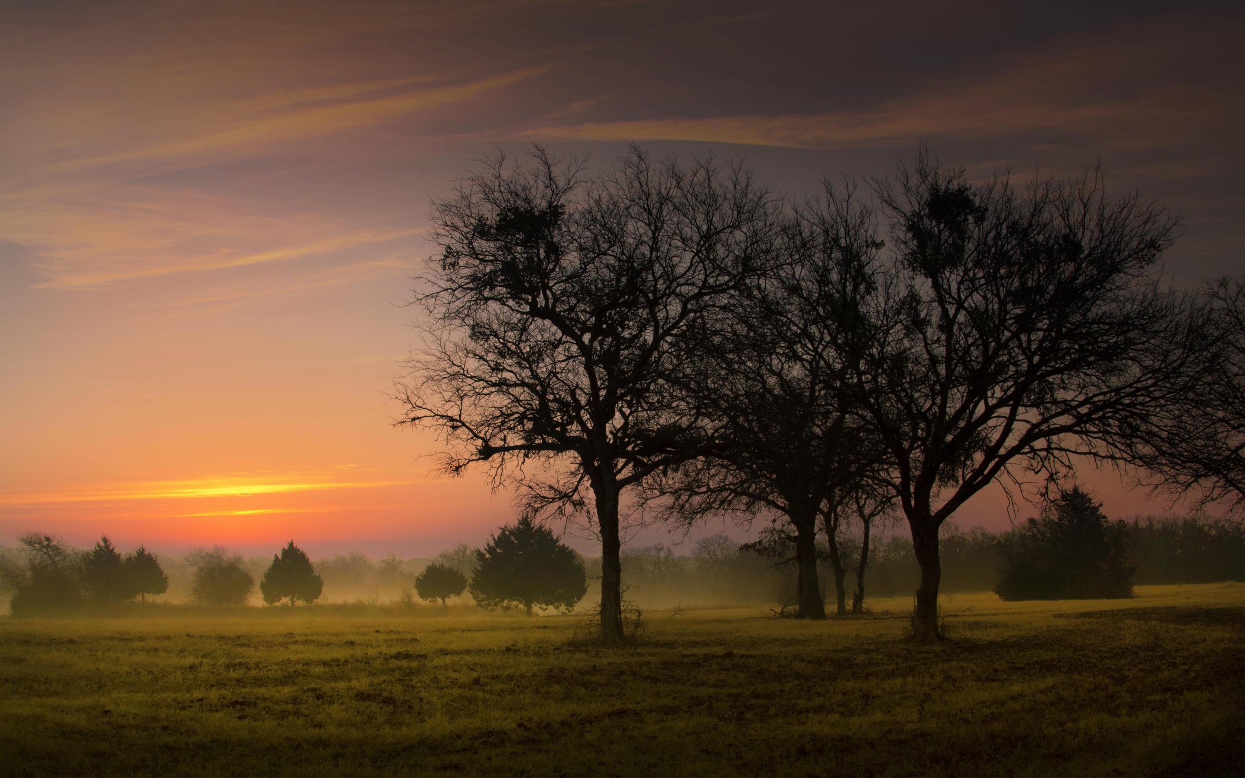 Description: A field with trees and a sunset in the background with clouds in the sky and a few trees in the foreground.