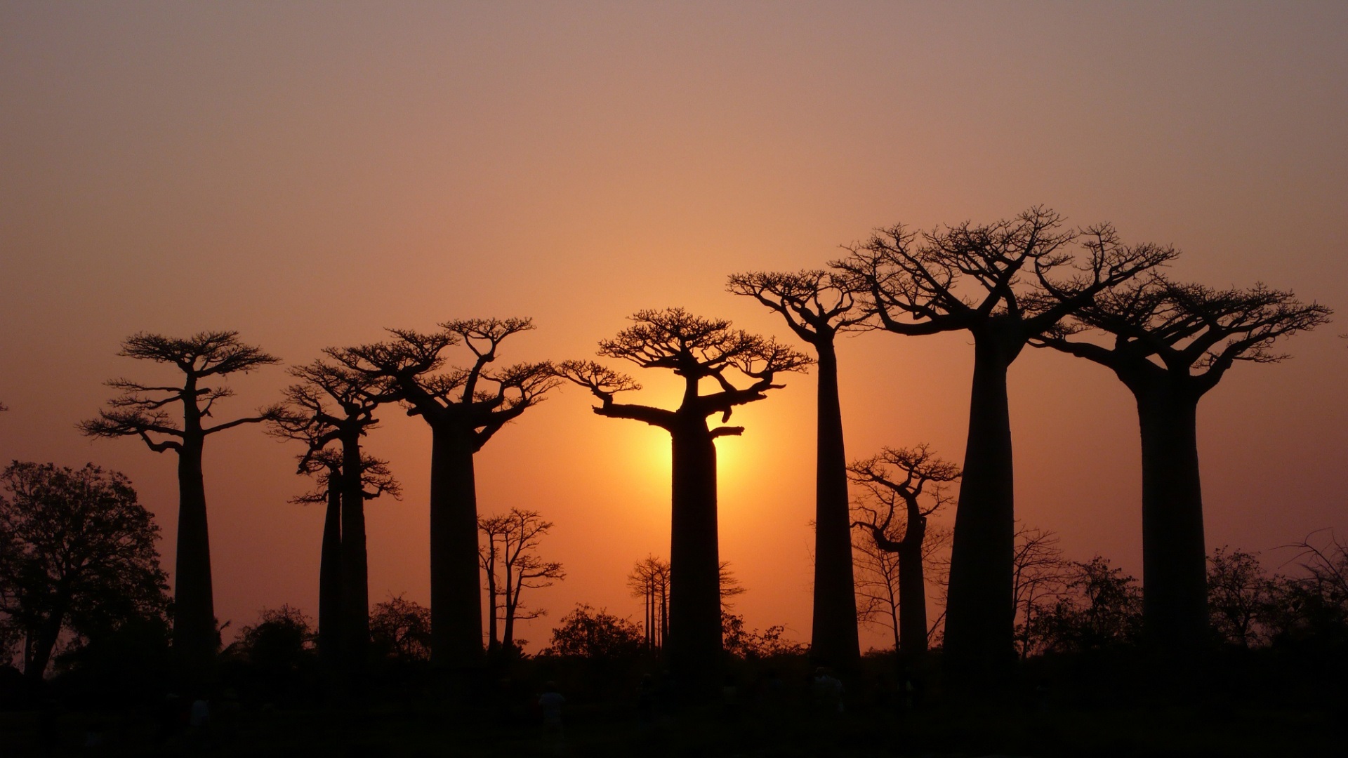 Description: A sunset with a group of trees in the foreground and a few people in the background in the foreground.