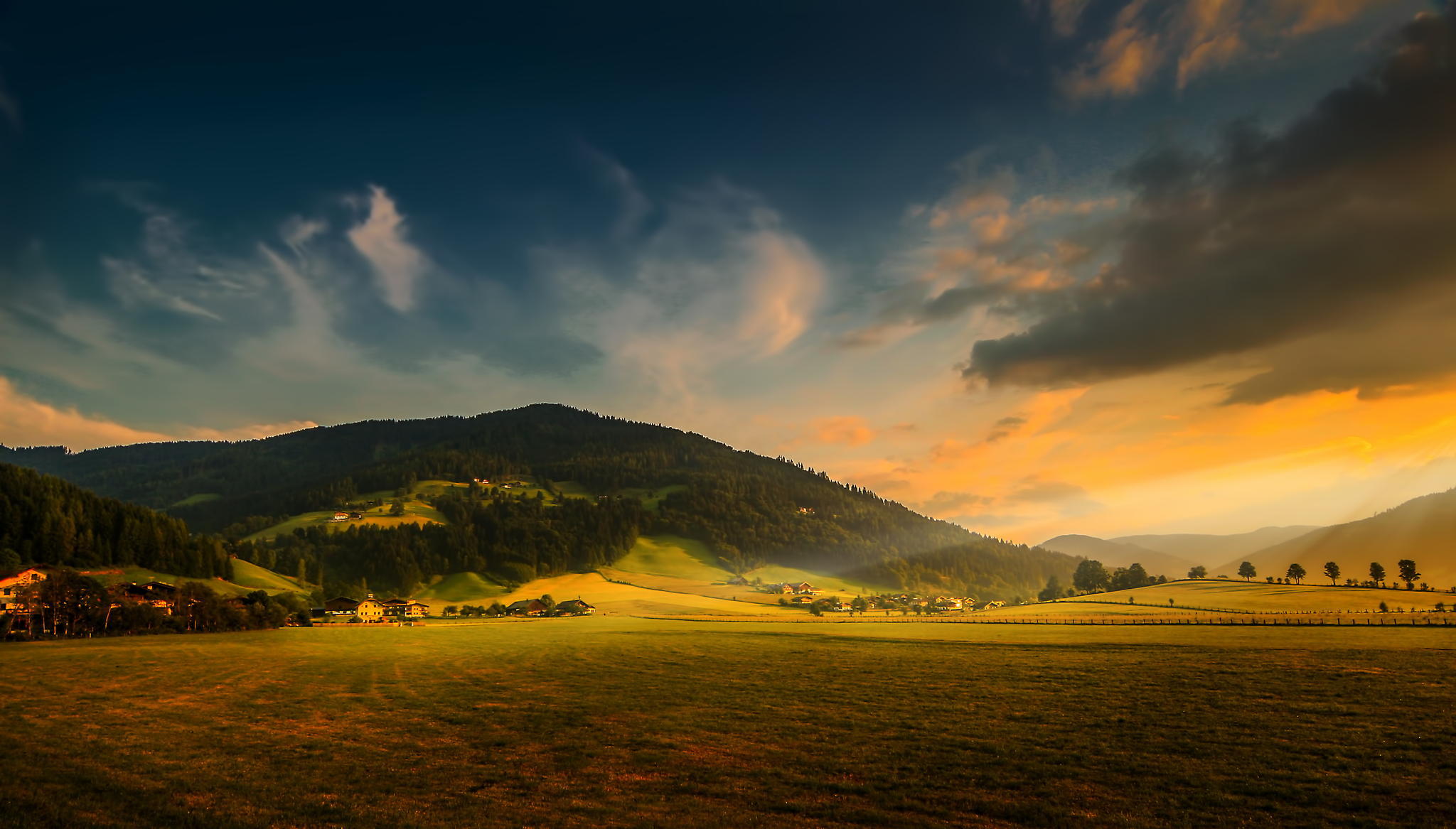 Description: A beautiful sunset over a green valley with a mountain in the background and a few clouds in the sky.