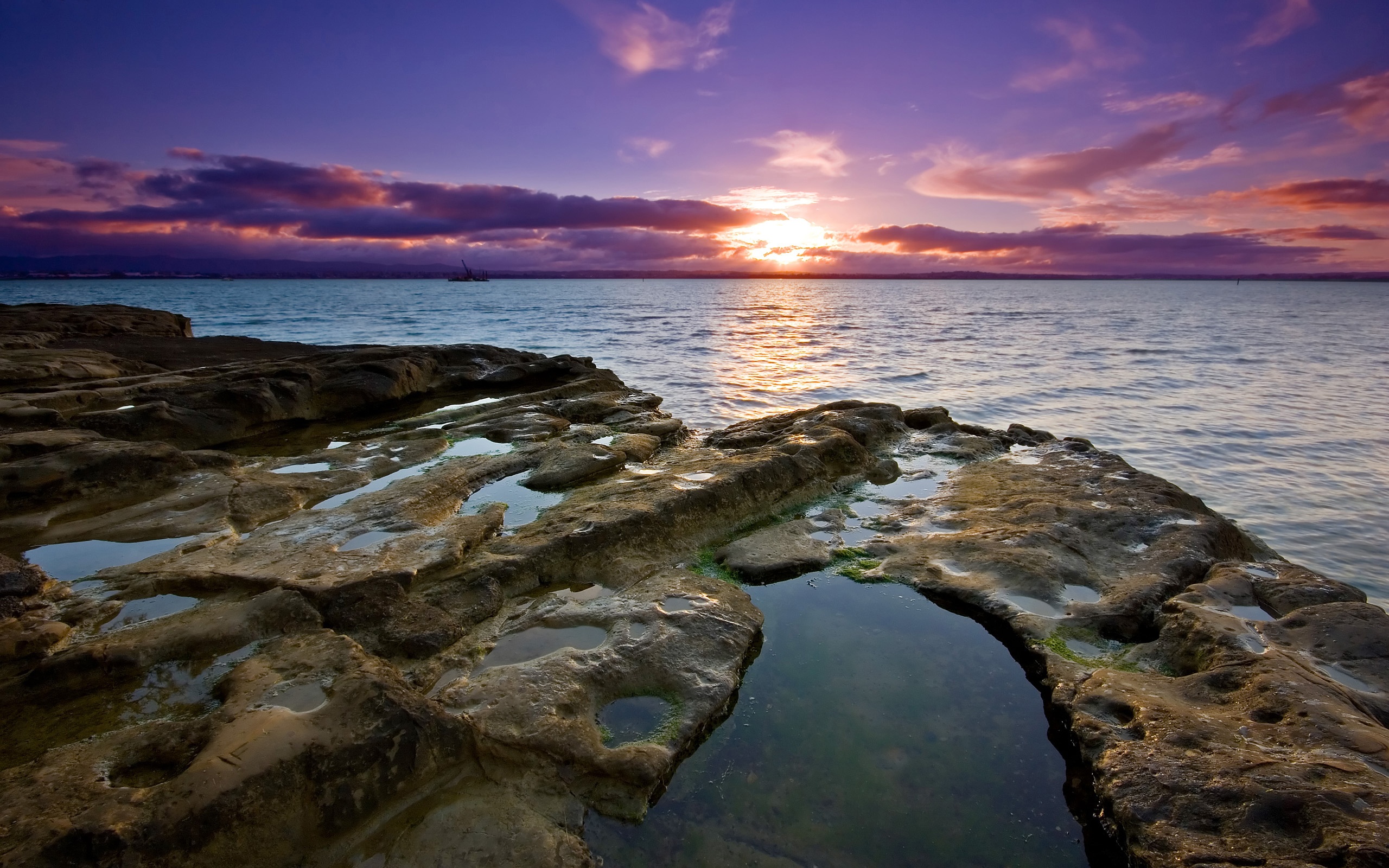 Description: A sunset over a body of water with rocks in the foreground and a boat in the distance in the distance.