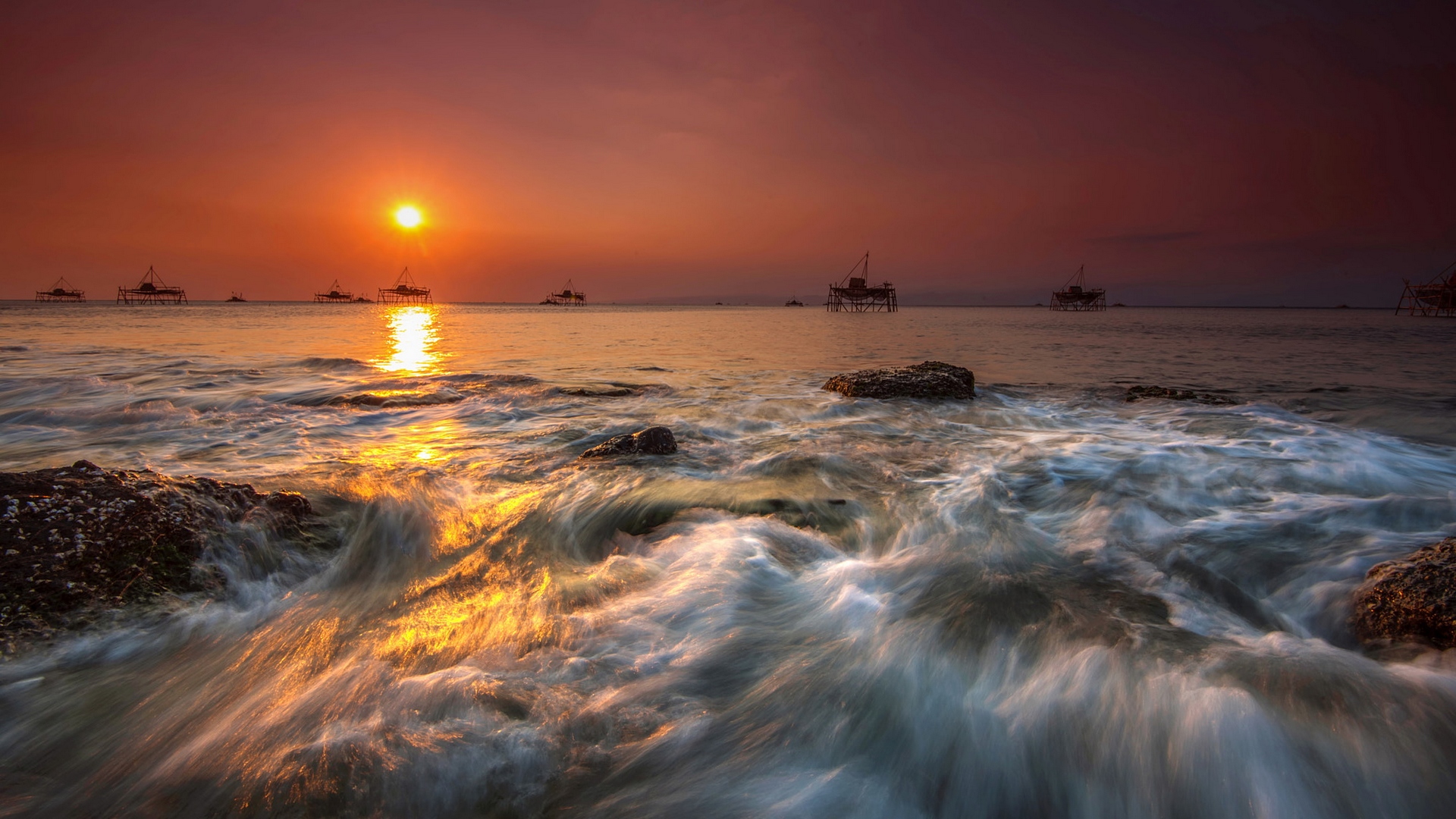 Description: A sunset over a body of water with ships in the distance and rocks in the foreground.
