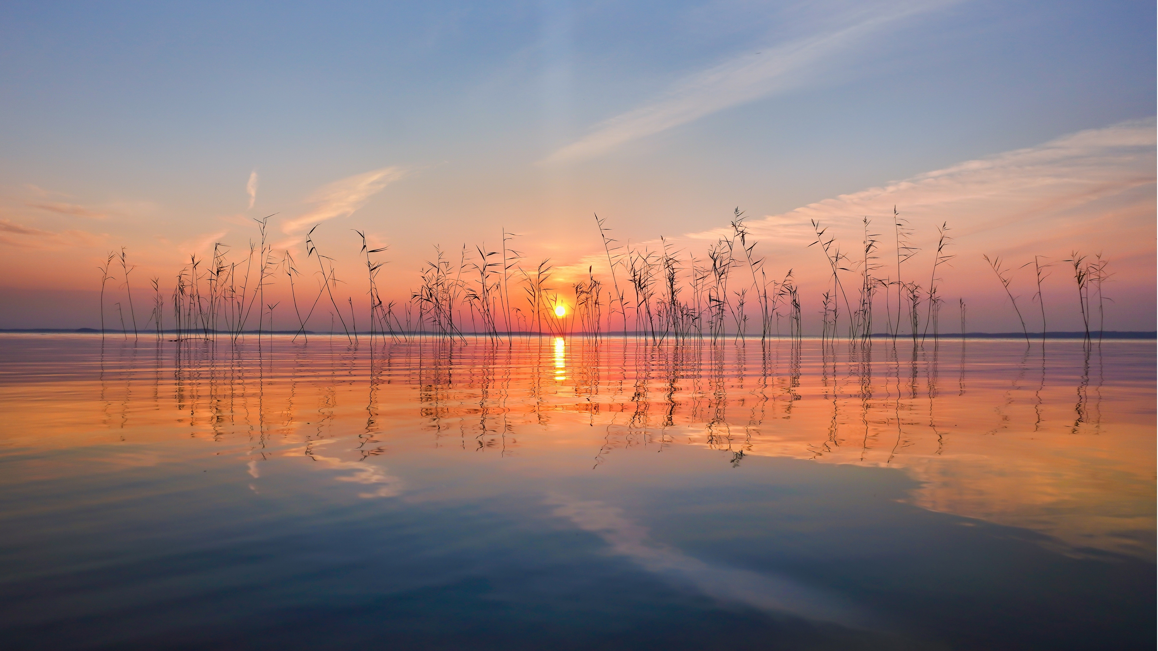 Description: A sunset over a body of water with tall grass in the foreground and a bright orange sky in the background.