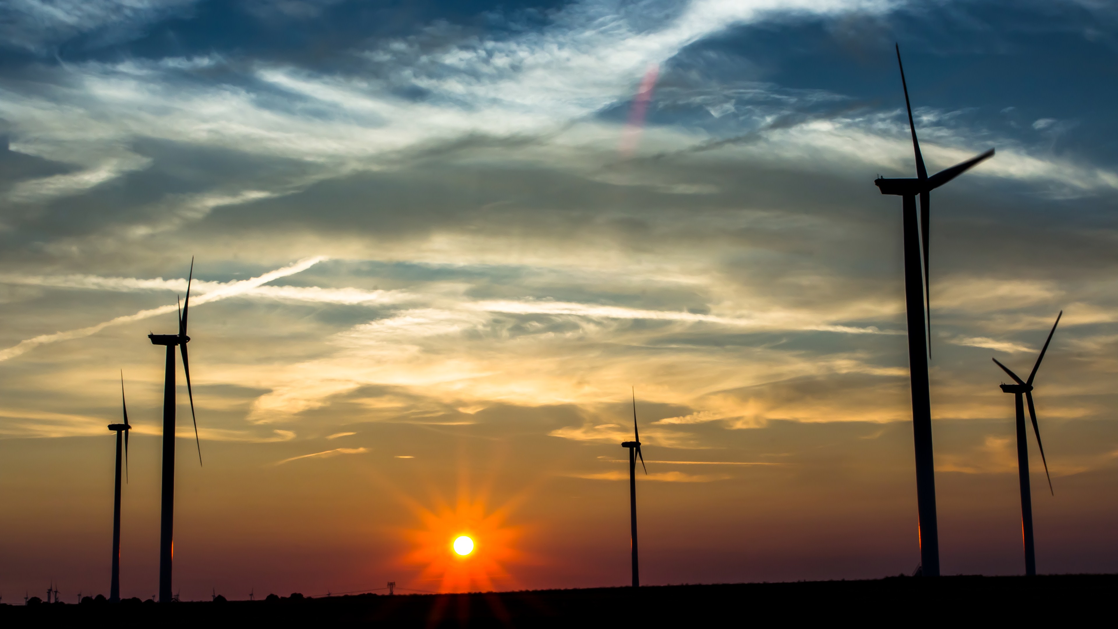 Description: A sunset with a few wind mills in the background and a few clouds in the sky above it.
