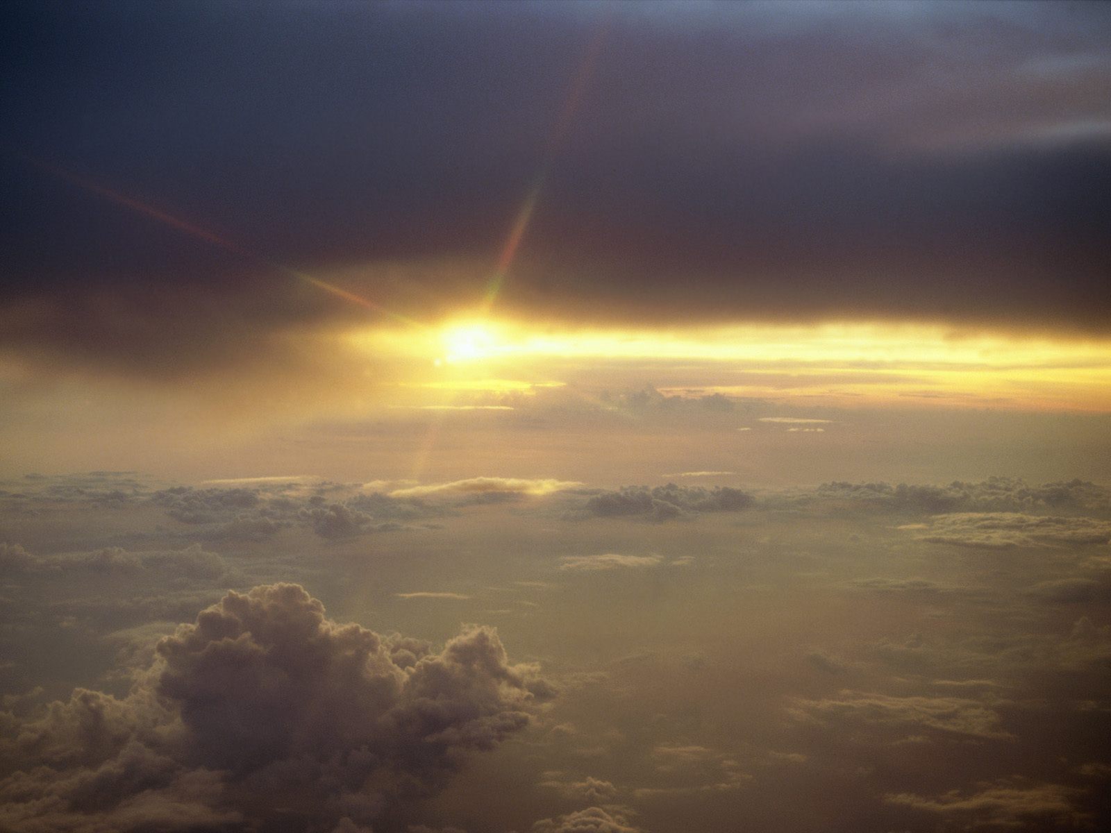 Description: The sun is shining through the clouds in the sky above the clouds are a few dark clouds and a few bright yellow rays.
