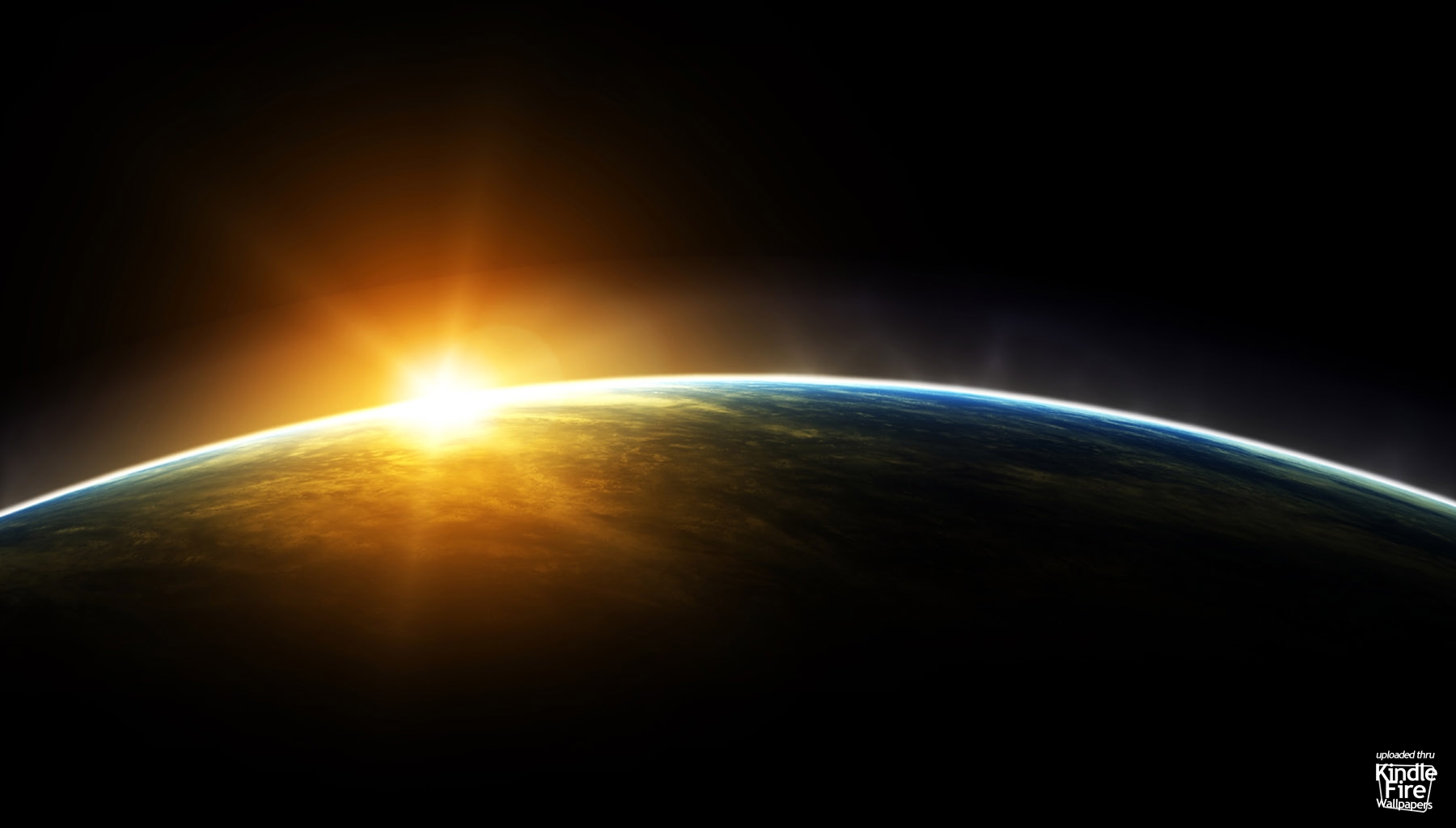 Description: The sun is shining brightly over the earth's horizon as it is seen from space in this artist's rendering.