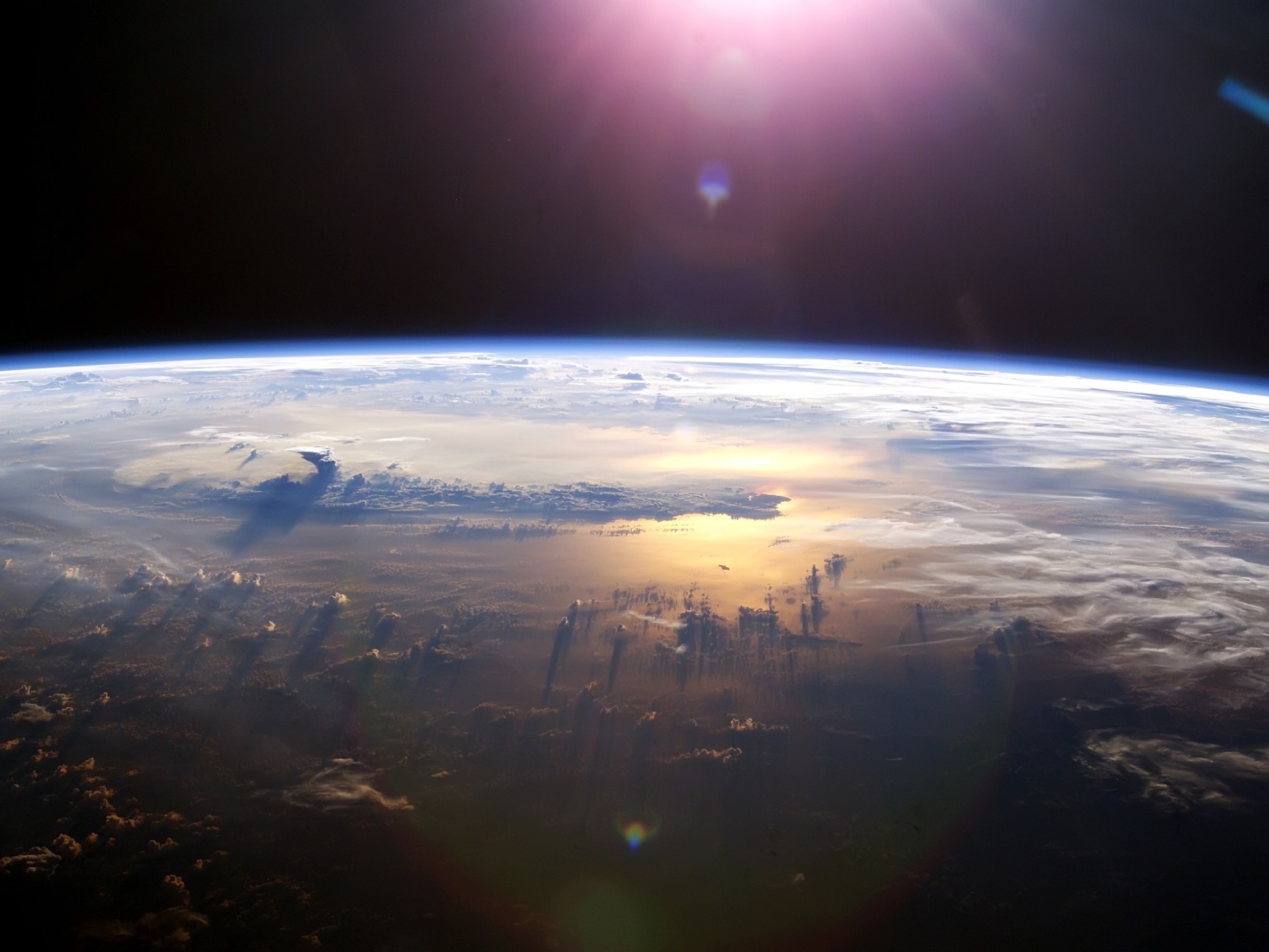 Description: The sun is shining over the earth from space shuttles in the distance.
