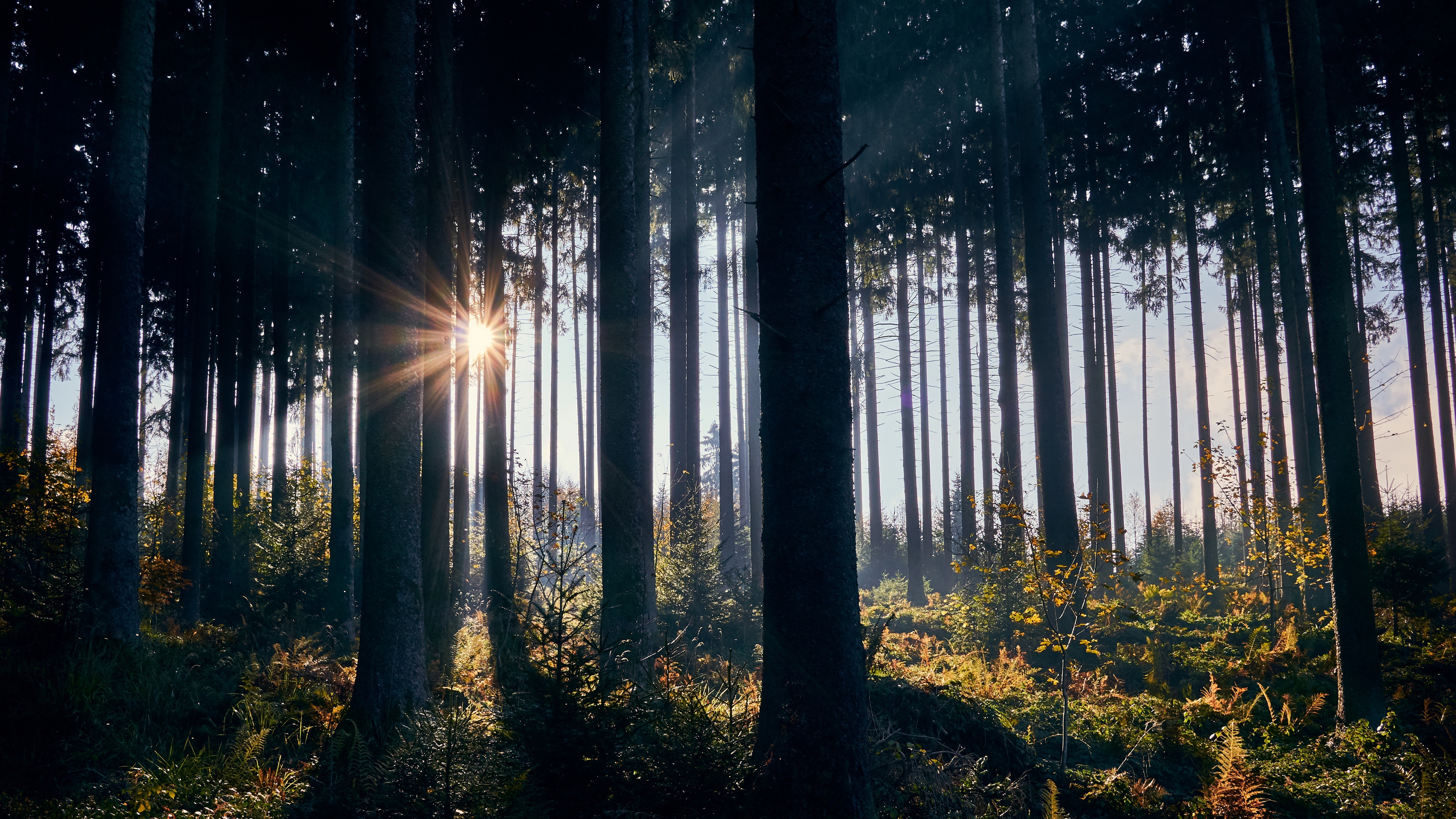 Description: A sun shines through the trees in a forest filled with tall trees and ferns on a sunny day.