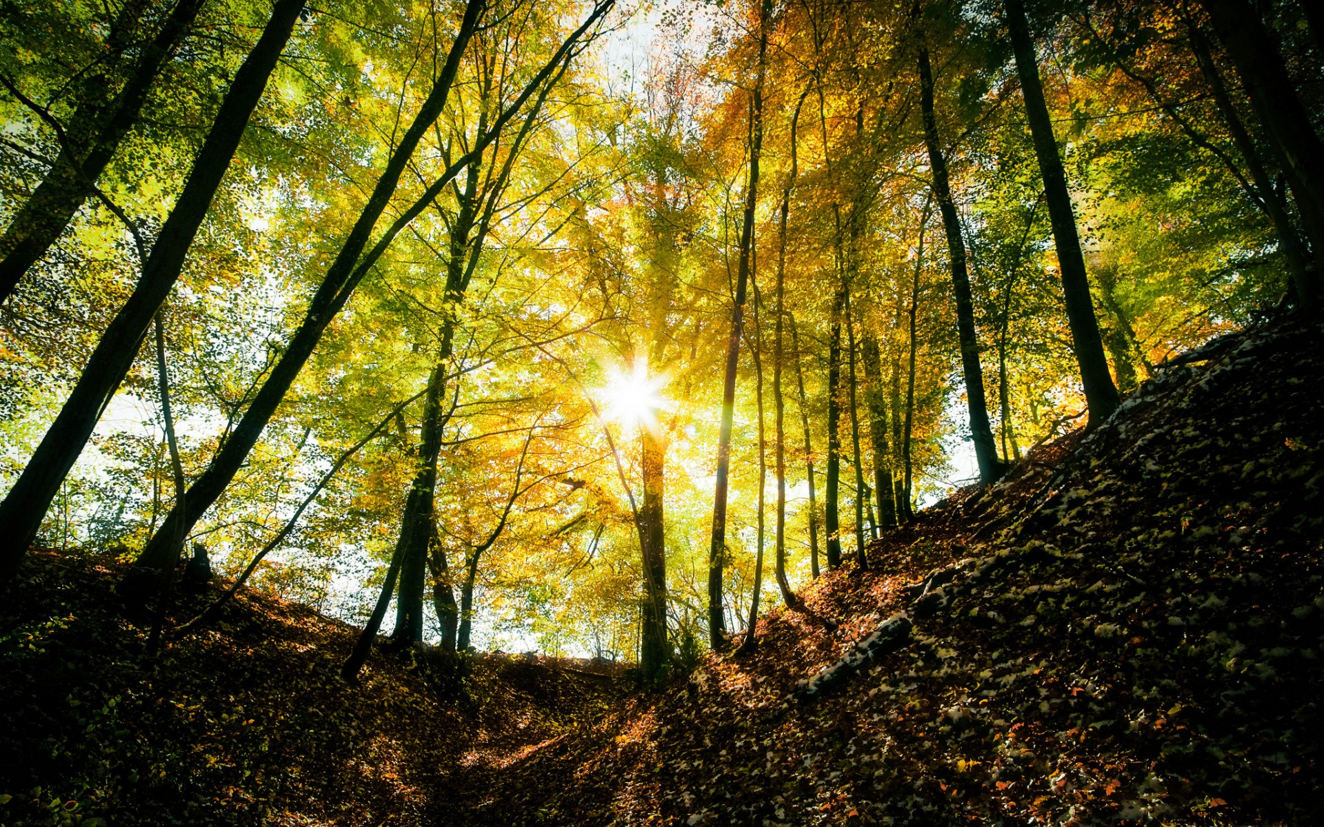Description: A sun shines through the trees in a forest filled with leaves and leaves on the ground.