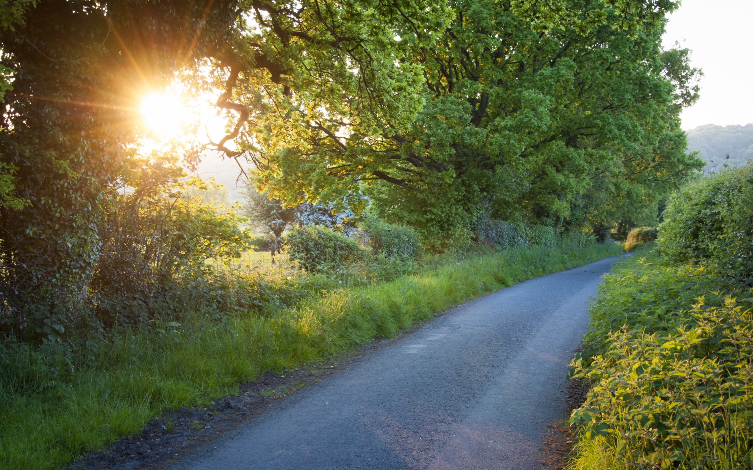 Description: A road surrounded by trees and bushes with the sun shining through the trees on the side of the road.