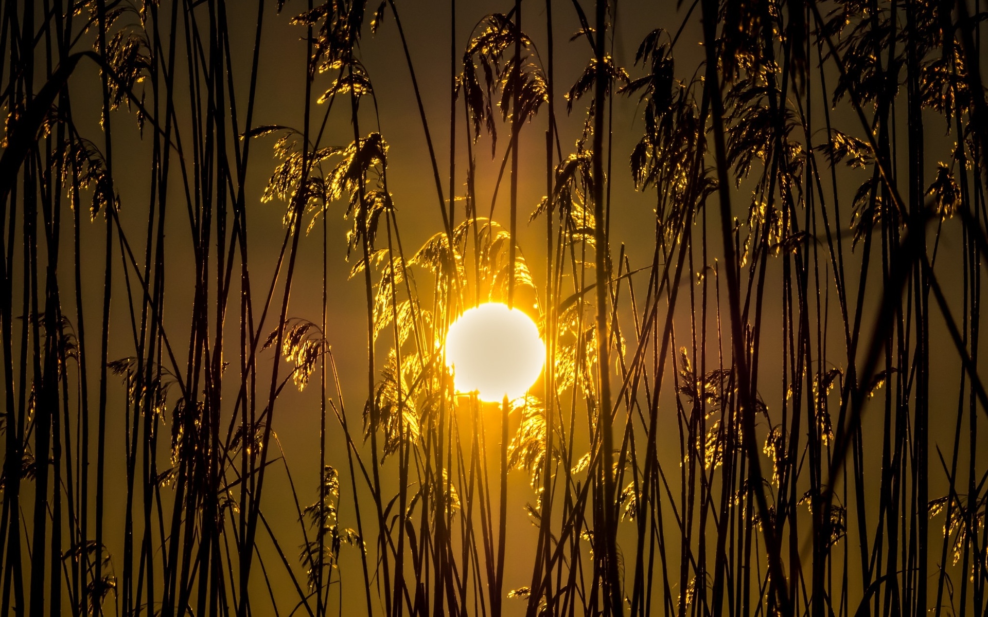 Description: A sun is shining through the tall grass in the evening sky.