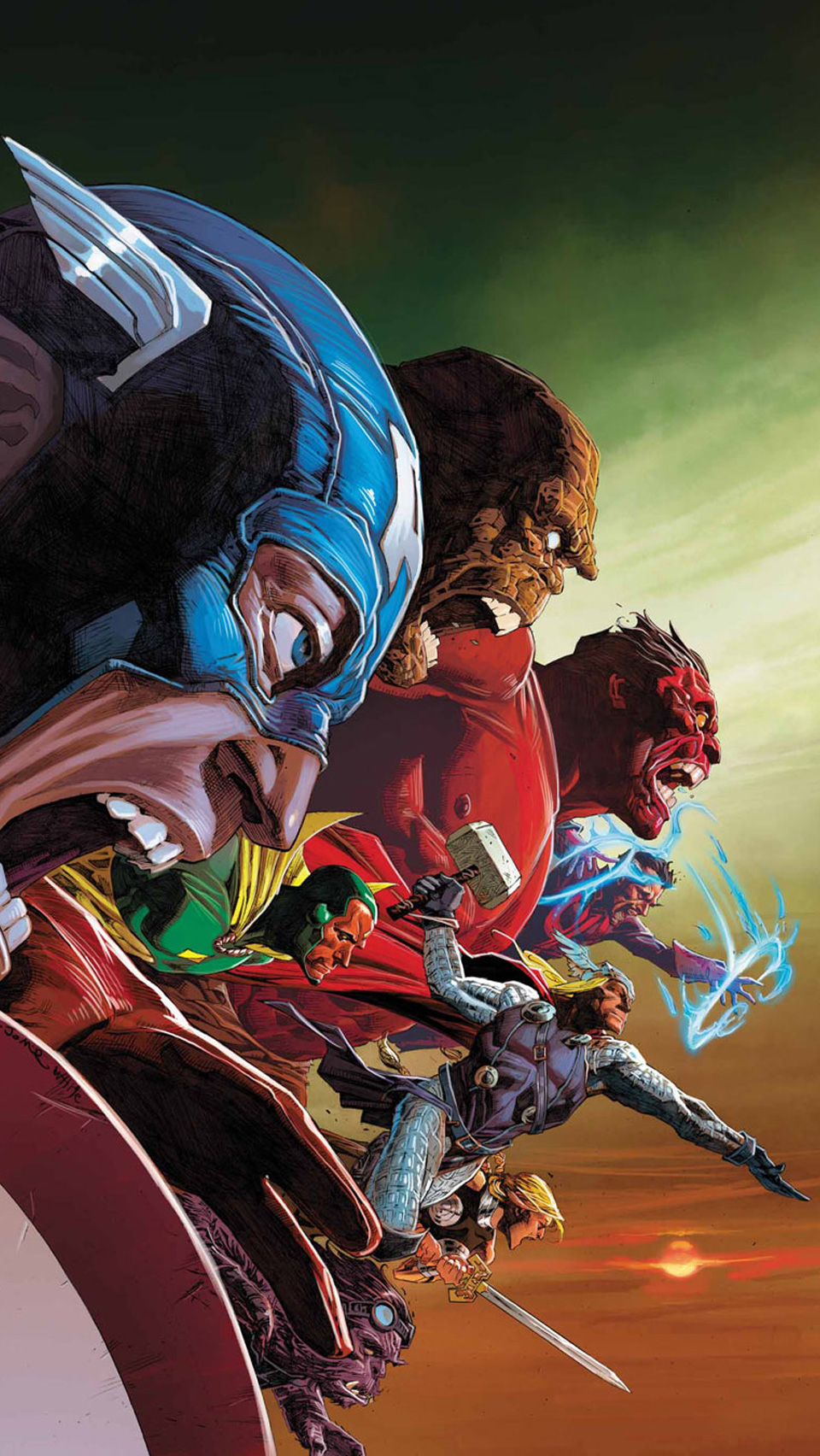 Description: A group of superheros flying through the air in front of a sunset sky with a red and blue background.