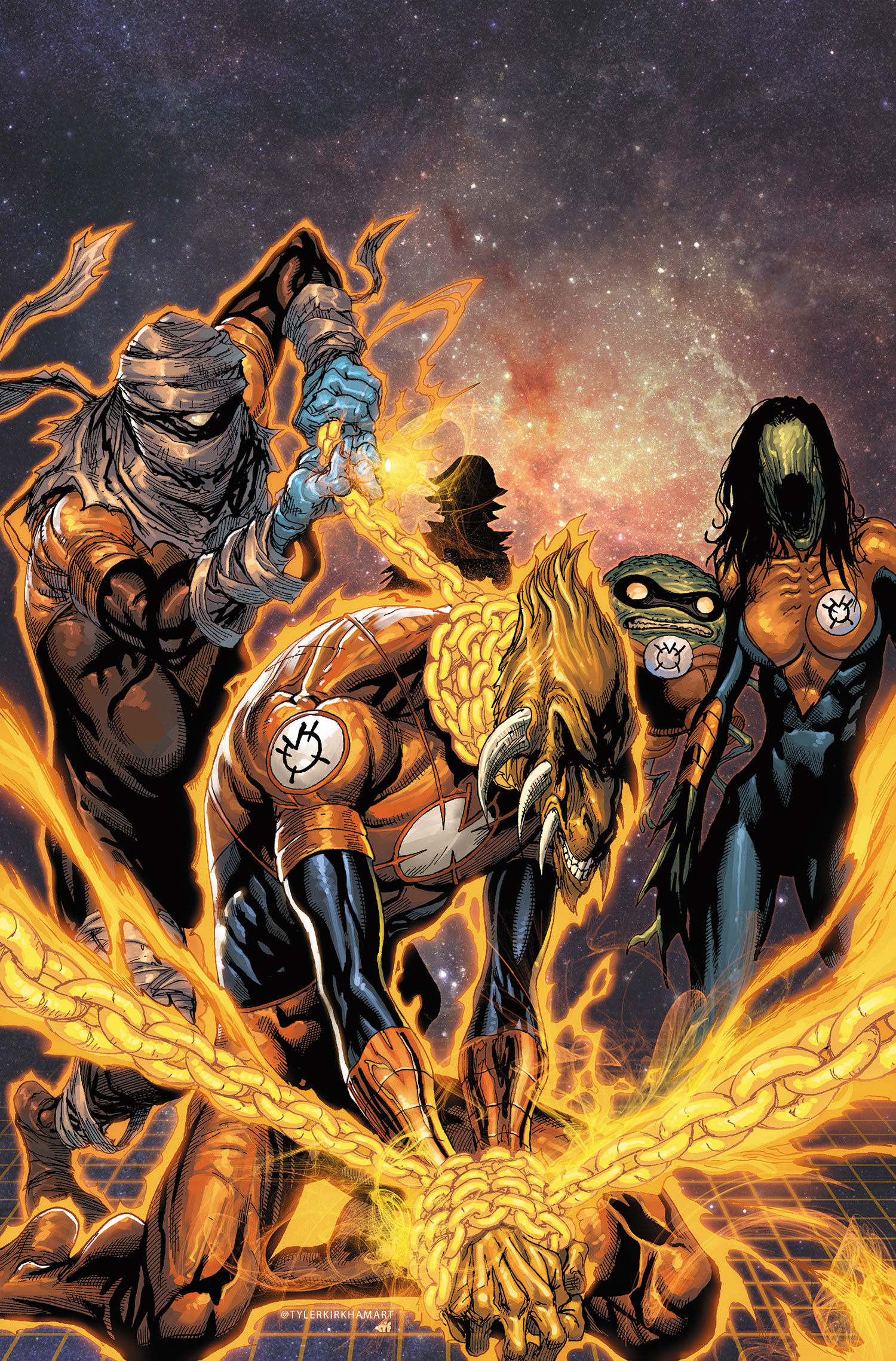 Description: A group of superheros in a space setting with a fireball in the air and a man with a gun.