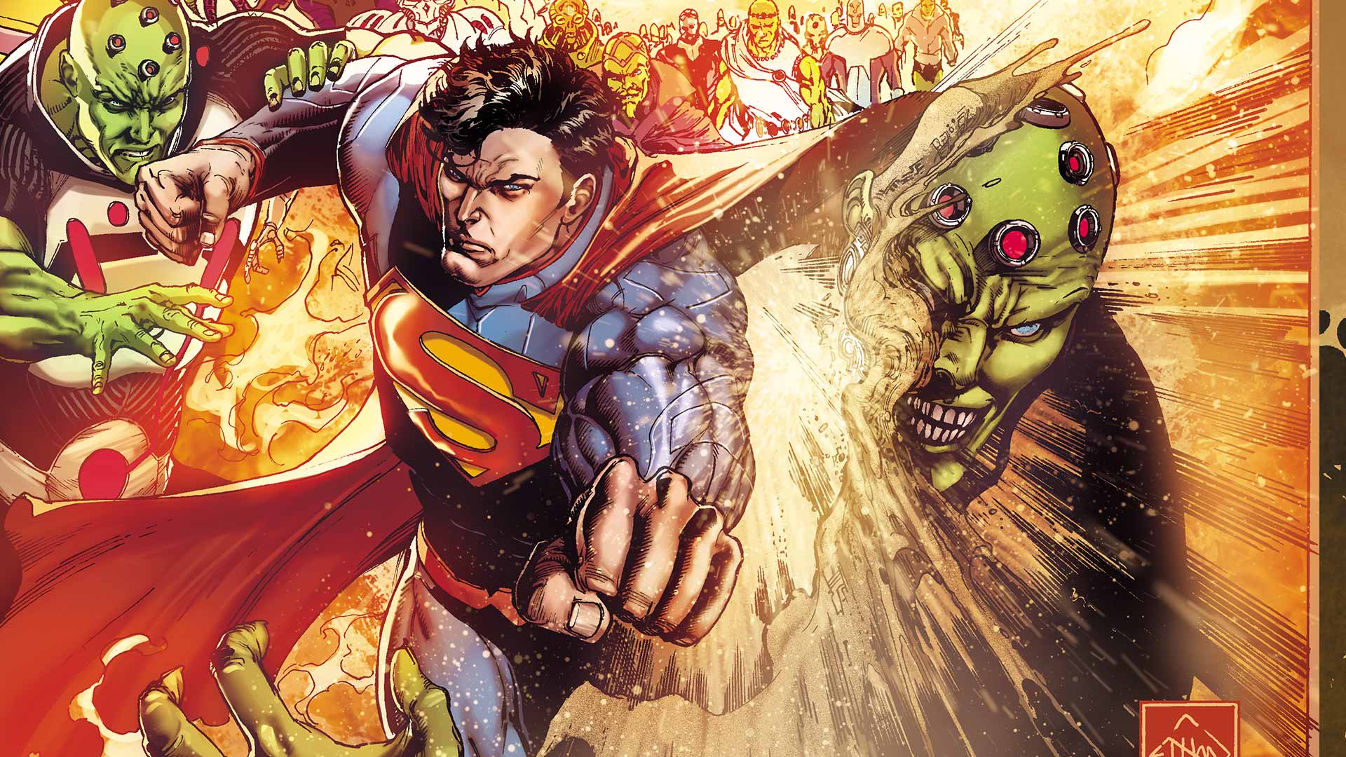 Description: A cover of a comic book with a superman and green man in the background and a group of zombies.