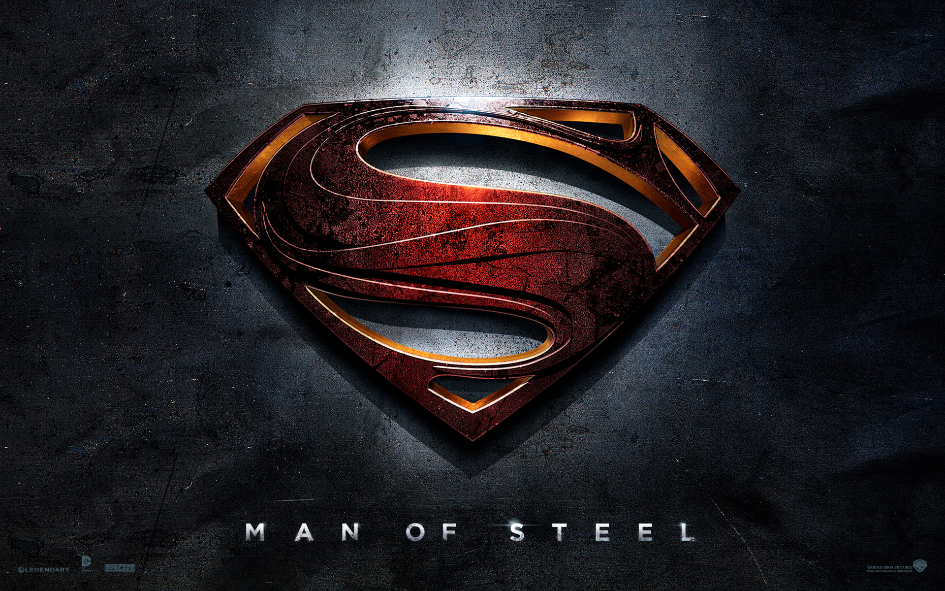 Description: A superman logo on a dark background with the word man of steel underneath it and a red and gold symbol.