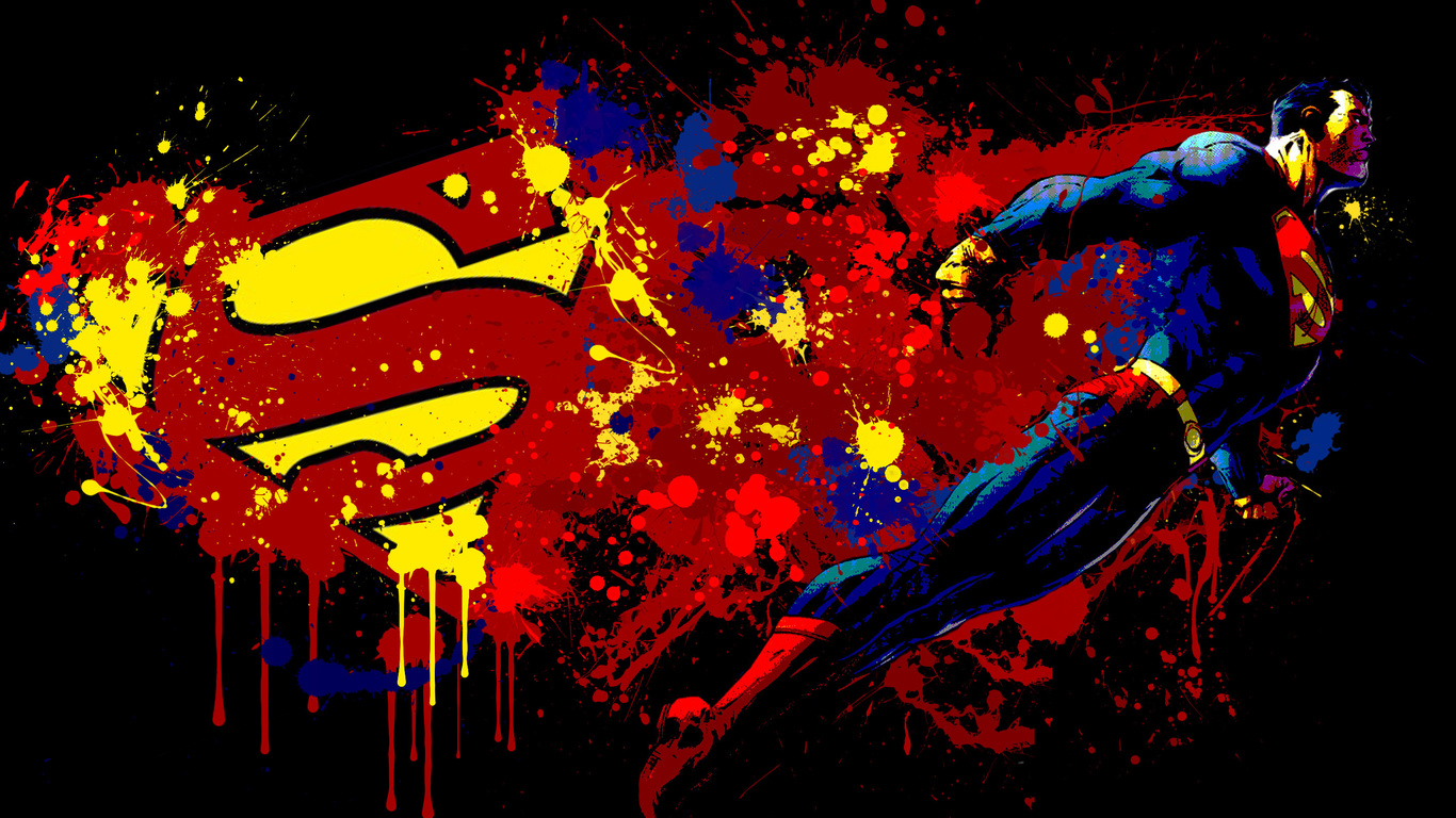 Description: A superman painting with paint splatters and a superman logo on it's chest and chest.