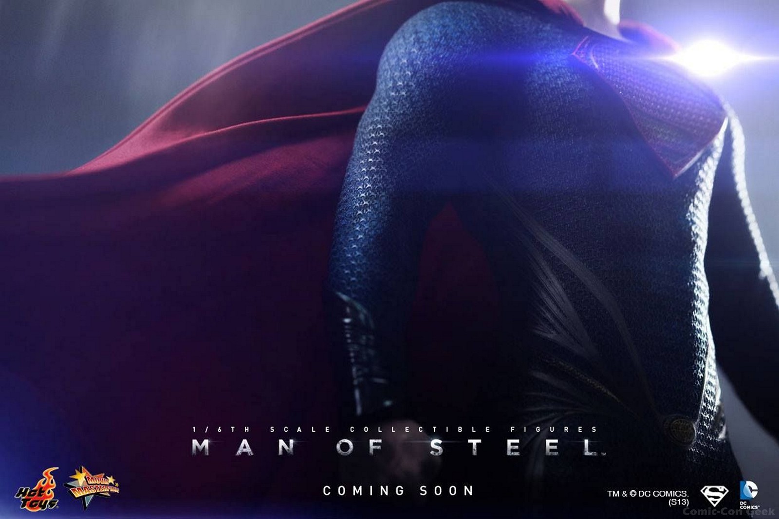 Description: A man of steel poster with a man in a cape and a light shining behind him.