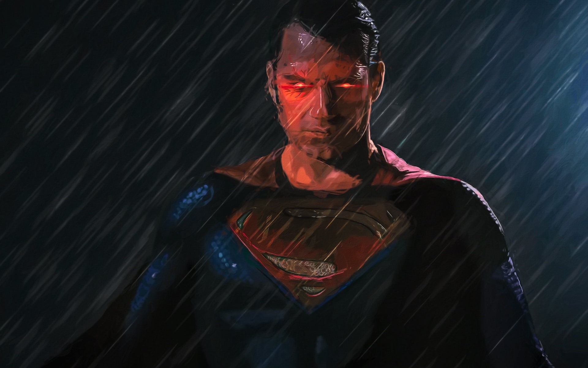 Description: A man in a superman suit standing in the rain with his eyes open and a red light shining on his face.