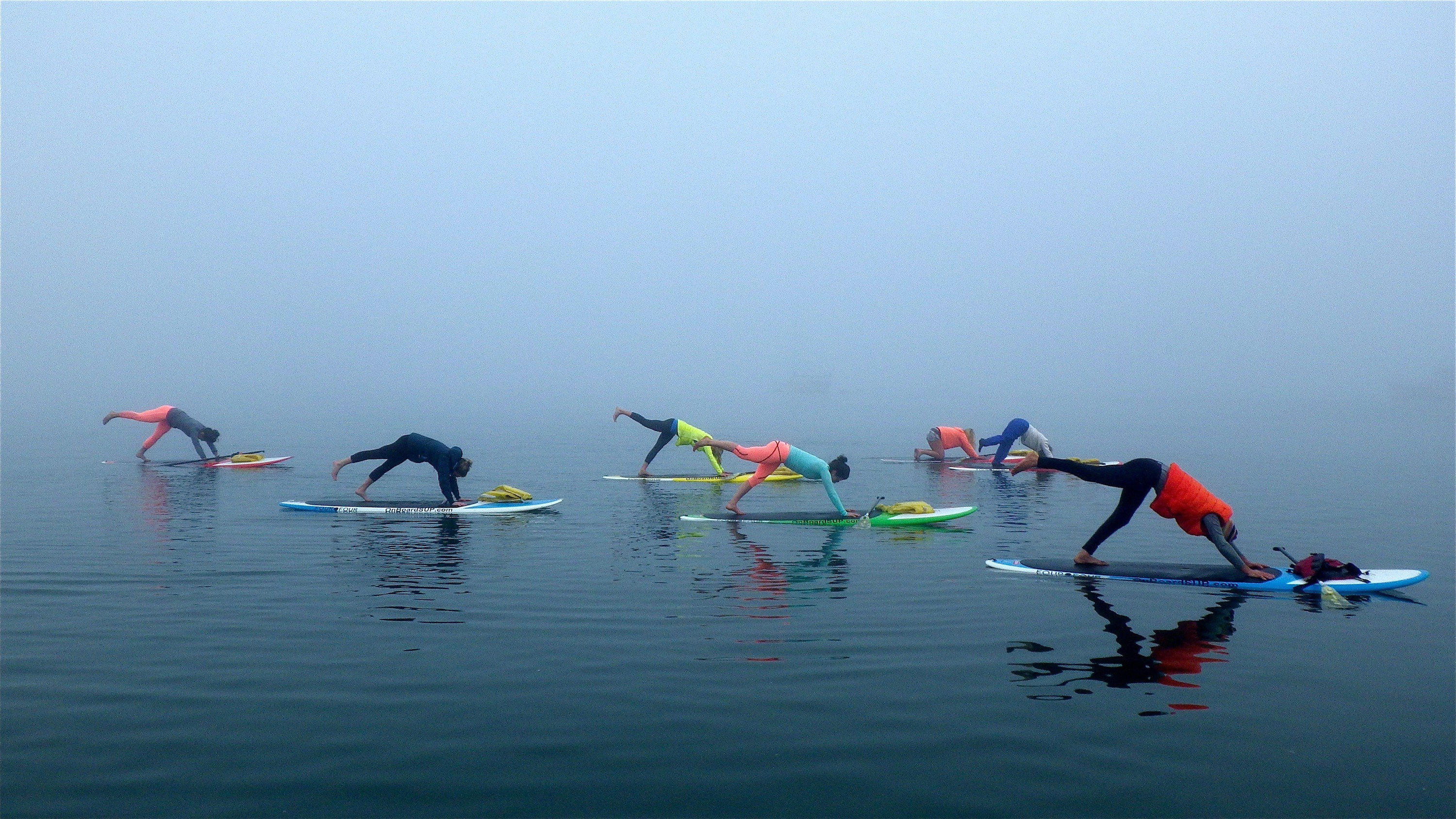 Description: A group of people on surfboards in the water doing yoga exercises on a foggy day in the ocean.