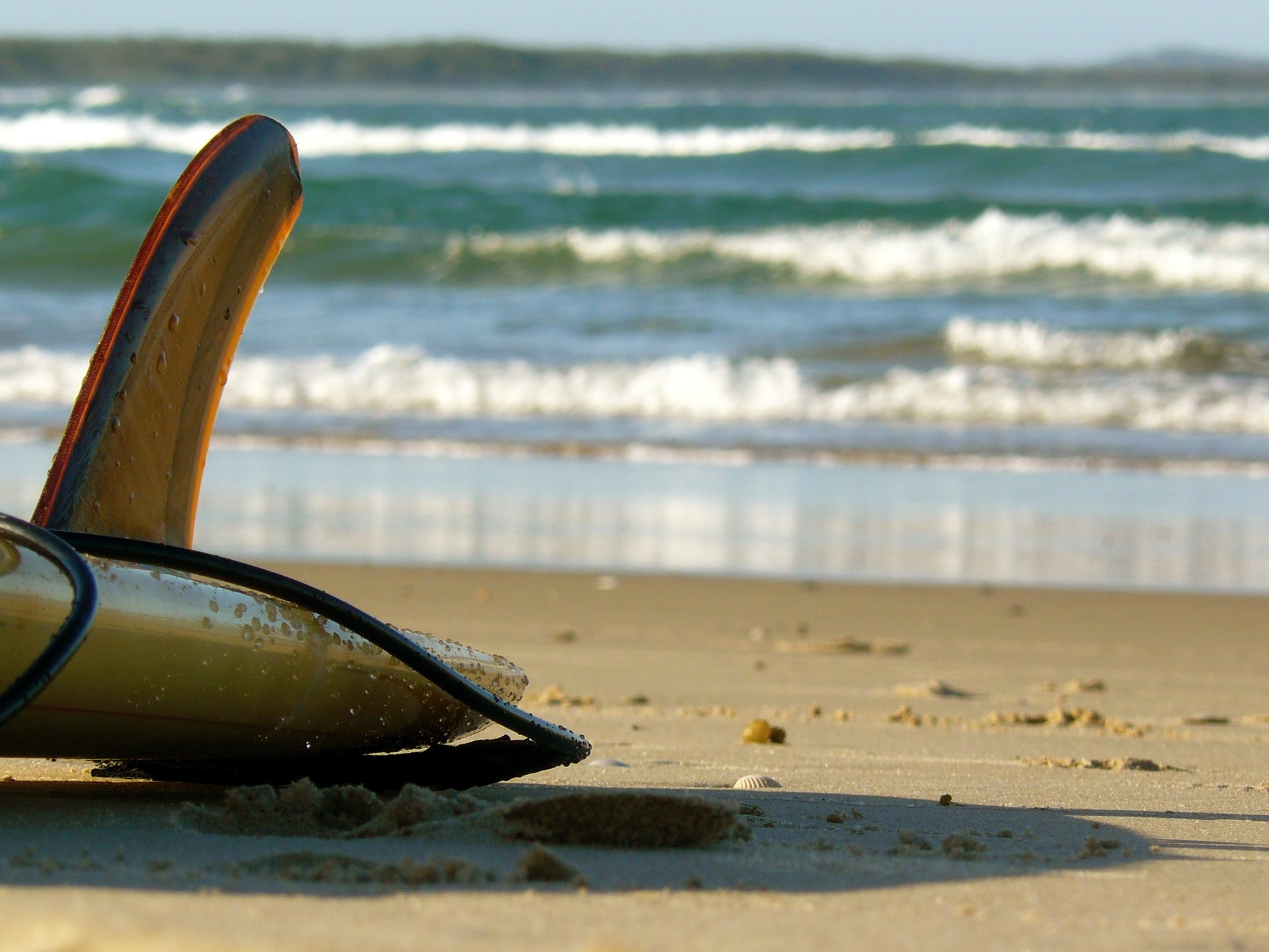 Description: A surfboard sticking out of the sand on a beach near the ocean with waves coming in from the ocean.