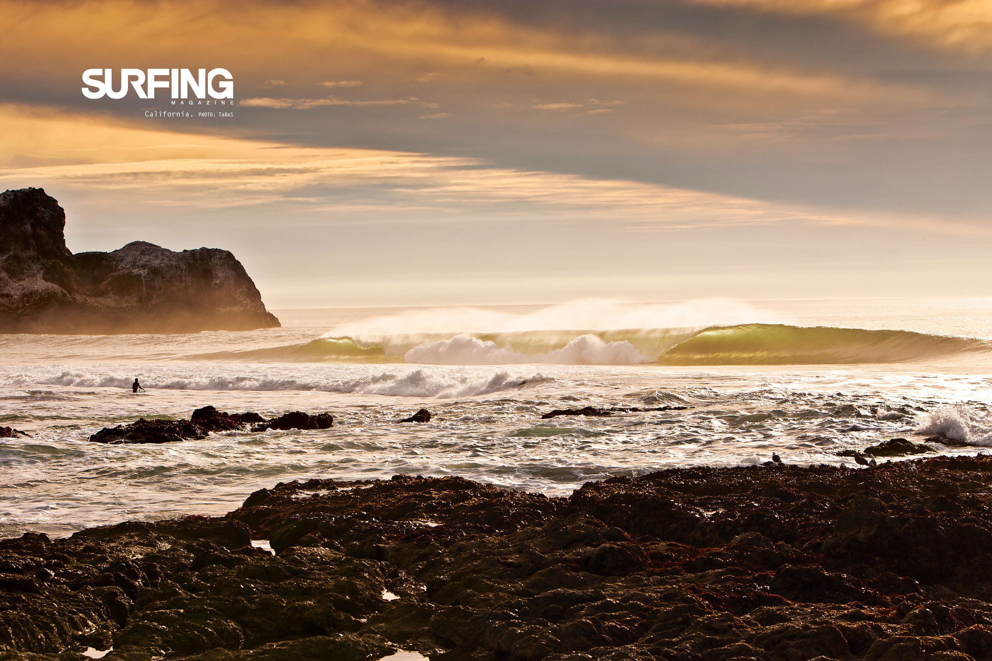 Description: A surfer is riding a wave in the ocean near a rocky shore with a rock formation in the background.
