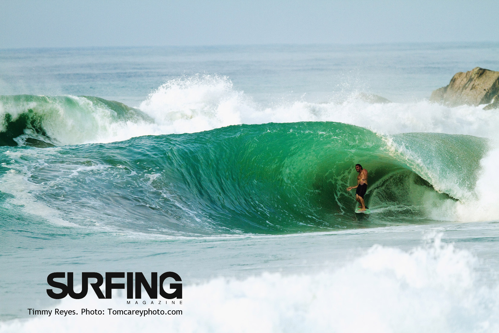 Description: A surfer riding a wave in the ocean with a rock in the background and a caption that reads surfing.