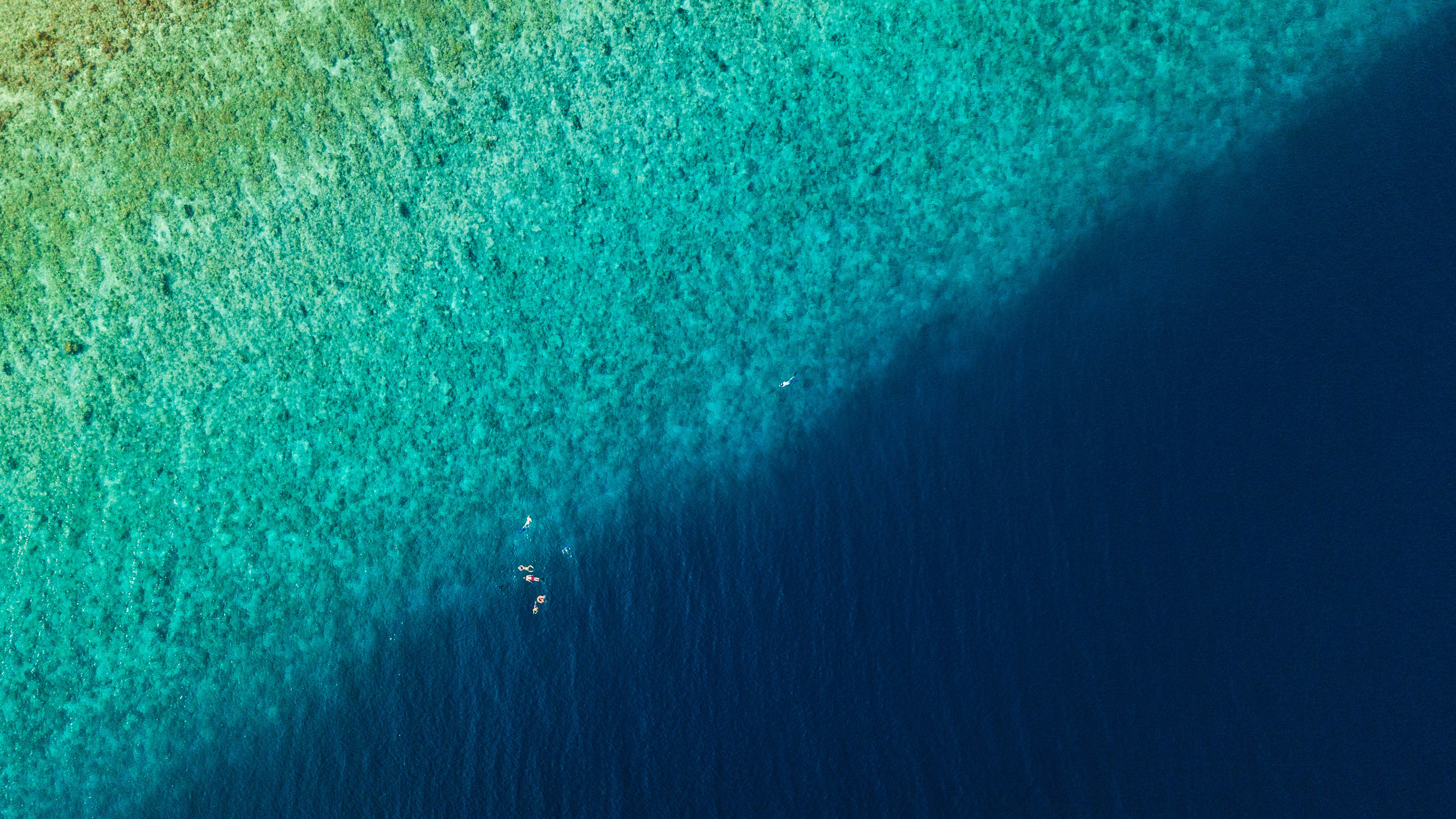 Description: A person riding a surfboard on a wave in the ocean near a beach area with a rainbow colored sand.