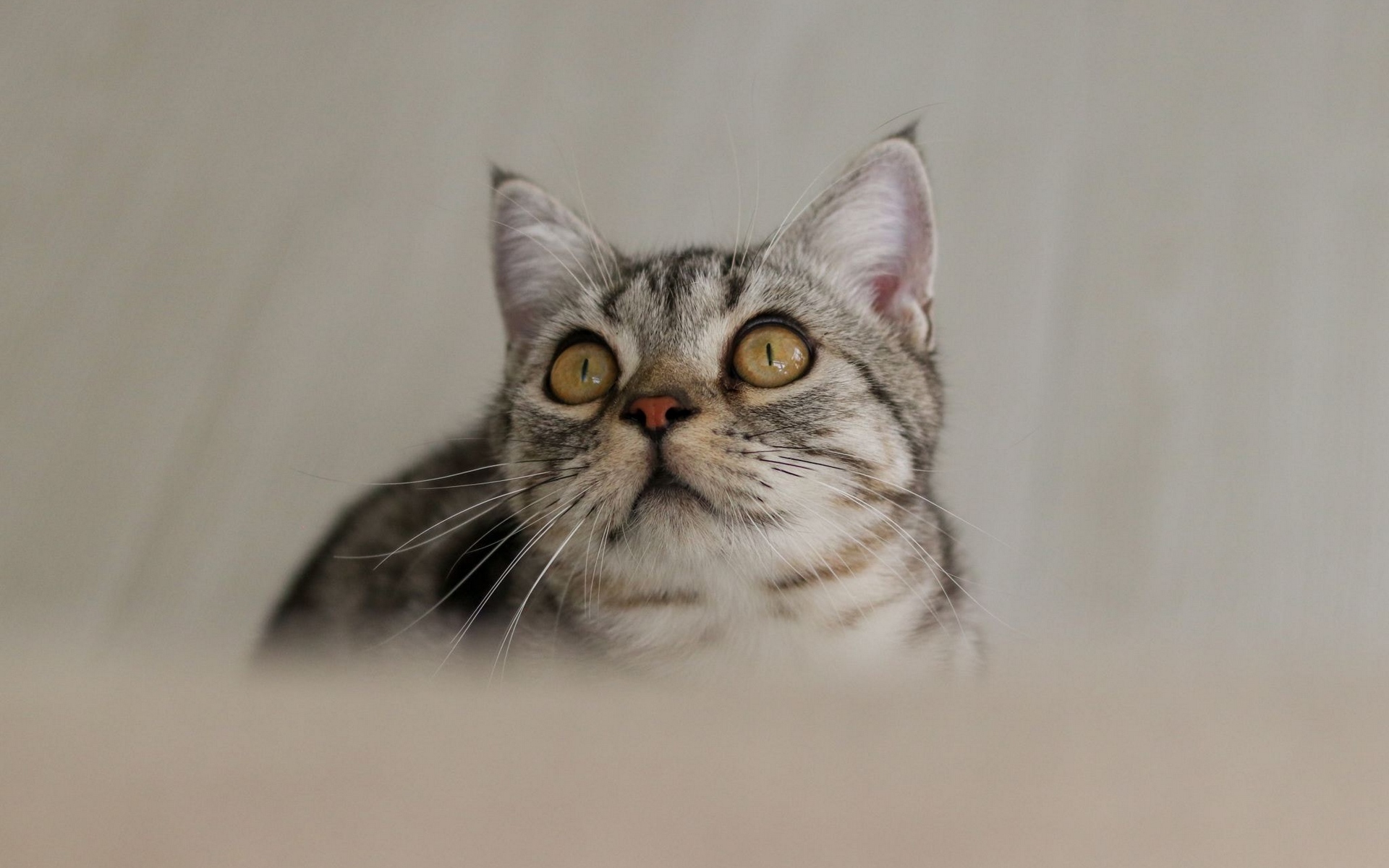Description: A cat with a surprised look on its face looking at the camera with a white background behind it and a white wall behind it.