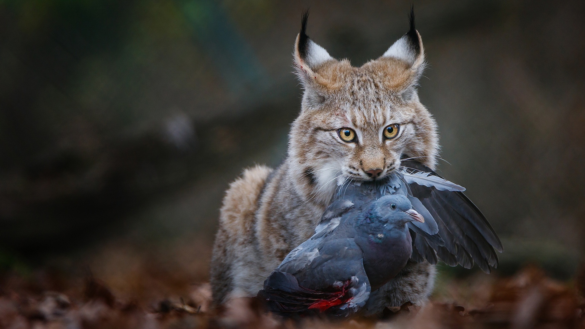Description: A cat is holding a bird in its mouth and it is looking at the camera with a surprised look on its face.